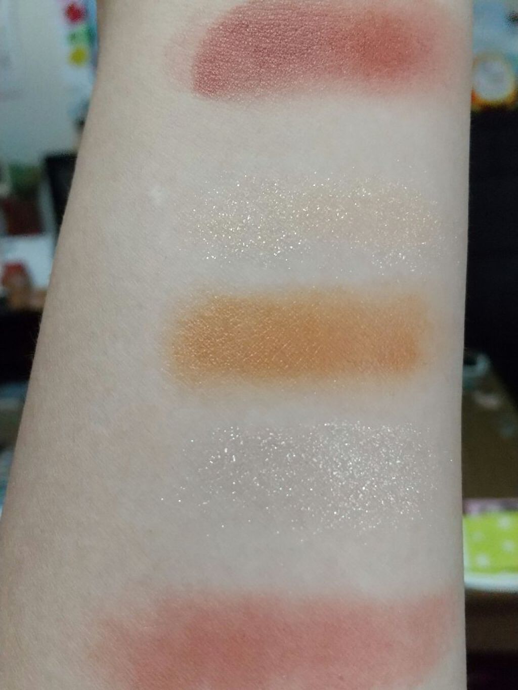 左上、左下、真ん中上、真ん中下、右上、右下という順番でスウォッチしてみました。 出してみると商品の写真より肌にのせたほうがくすみが出るかな✨という印象です😌 伸ばしやすくて指でも筆でもつけやすいです☺️💕 とっても可愛いカラーなのでオススメです💠