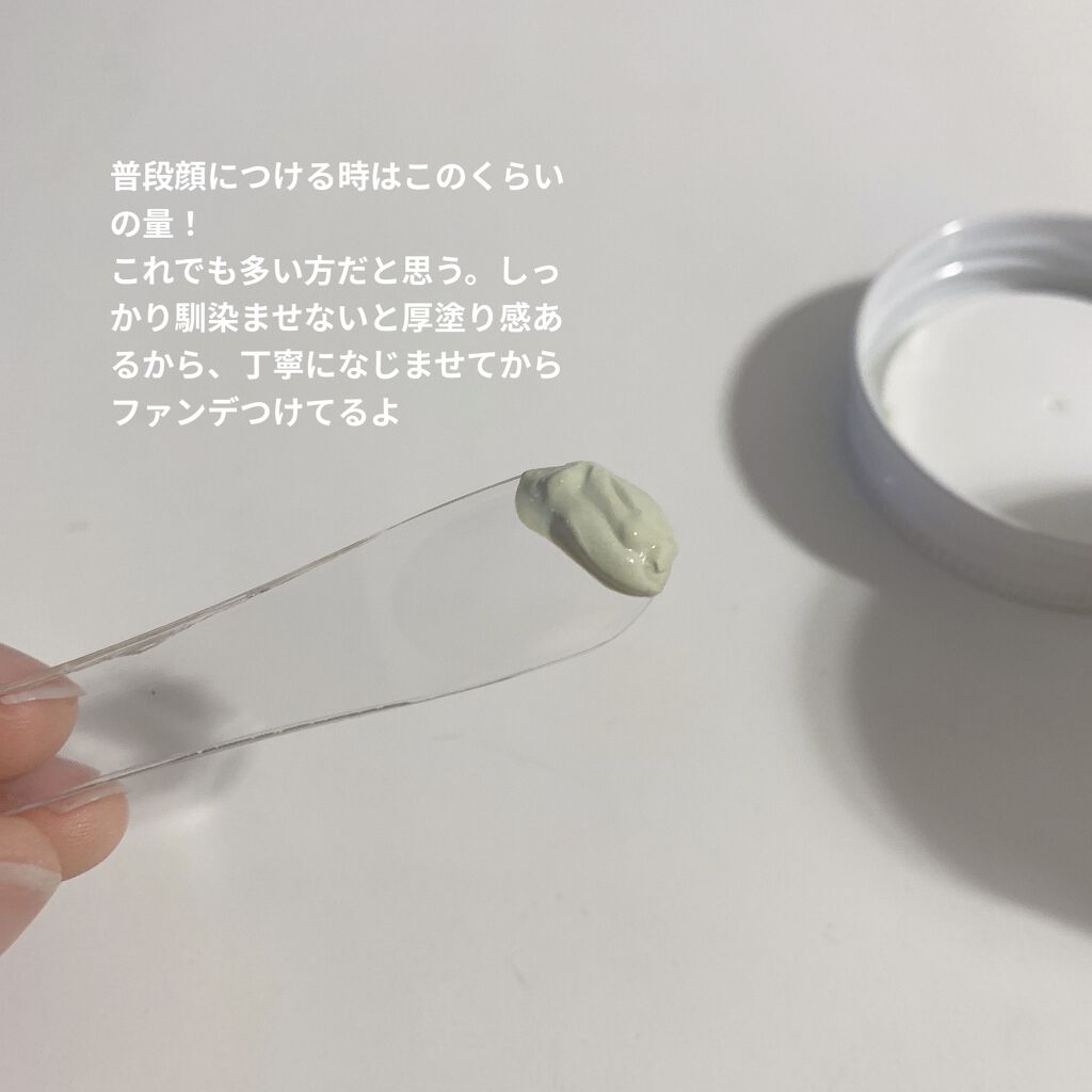 - 赤みをきちんとカバーするスキンケア兼用下地。緑色のクリームが肌でベージュ色に変化し、ニキビ跡やくすみをカバーします。