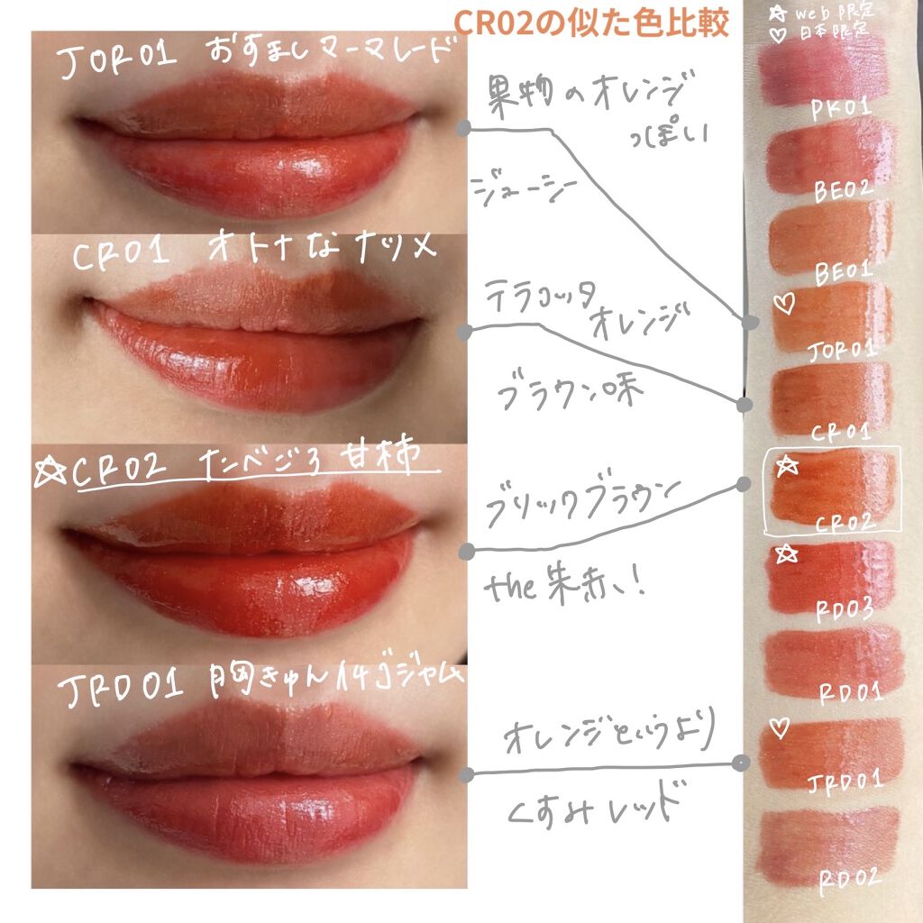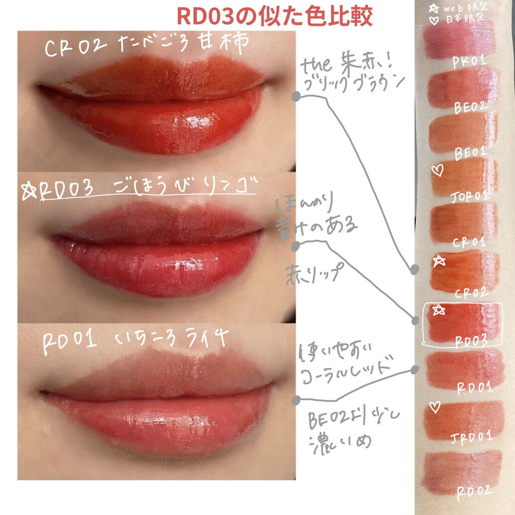 - Point 1 ジューシーなもぎたて果実のような発色が長時間続く Point 2 キラキラ輝くスパークリングジュエリーパウダー配合 Point 3 リップケアオイル配合で、クリアな光沢感のある仕上がり RD03、CR02は公式オンライン限定発売