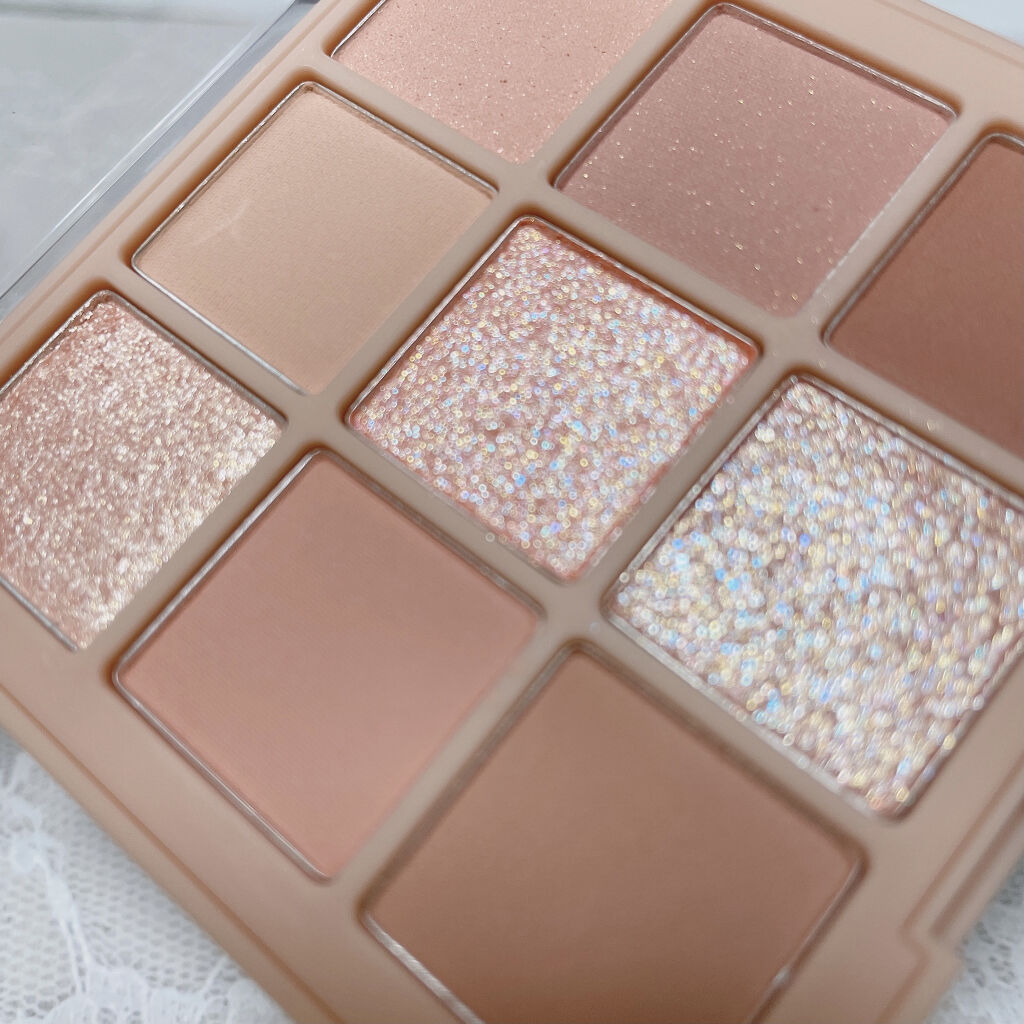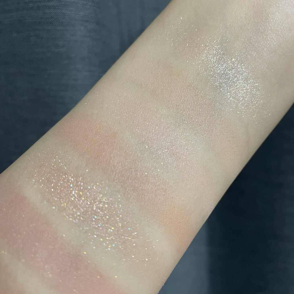 mude.の方がよりあたたかみのある印象で全体的に使いやすい色味が入っている感じ◎ ラメ感もギラギラするよりかは上品なキラキラ感✨ rom&ndはmude.に比べるとフレッシュな印象!春や夏に使うと映えそう❣️ ラメ感も強く、目立つかな。 似てるかもしれないからと買うのを長い間悩んでいましたが、仕上がりが全然変わってくるので、買って良かった😂❤️ 粉質はブランドも違うので違ったよ✨ rom&ndの方がしっとり感があって強く発色する感じ。 mude.は淡い発色で、初心者さんも使いやすいと思った🫶🏻