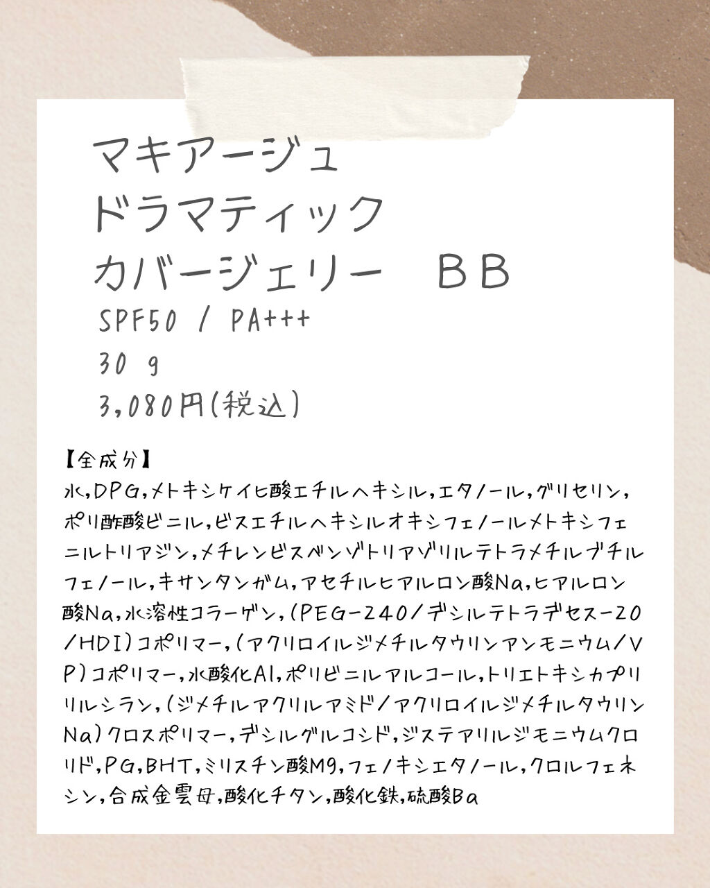 - <ライトベージュ> 水、DPG、メトキシケイヒ酸エチルヘキシル、エタノール、グリセリン、ポリ酢酸ビニル、ビスエチルヘキシルオキシフェノールメトキシフェニルトリアジン、メチレンビスベンゾトリアゾリルテトラメチルブチルフェノール、キサンタンガム、アセチルヒアルロン酸Na、ヒアルロン酸Na、水溶性コラーゲン、(PEG-240/デシルテトラデセス-20/HDI)コポリマー、(アクリロイルジメチルタウリンアンモニウム/VP)コポリマー、水酸化Al、ポリビニルアルコール、トリエトキシカプリリルシラン、(ジメチルアクリルアミド/アクリロイルジメチルタウリンNa)クロスポリマー、デシルグルコシド、ジステアリルジモニウムクロリド、PG、BHT、ミリスチン酸Mg、フェノキシエタノール、クロルフェネシン、合成金雲母、酸化チタン、酸化鉄、硫酸Ba <M101617-202> <ミディアムベージュ> 水、DPG、メトキシケイヒ酸エチルヘキシル、エタノール、グリセリン、ポリ酢酸ビニル、ビスエチルヘキシルオキシフェノールメトキシフェニルトリアジン、メチレンビスベンゾトリアゾリルテトラメチルブチルフェノール、キサンタンガム、アセチルヒアルロン酸Na、ヒアルロン酸Na、水溶性コラーゲン、(PEG-240/デシルテトラデセス-20/HDI)コポリマー、(アクリロイルジメチルタウリンアンモニウム/VP)コポリマー、水酸化Al、ポリビニルアルコール、トリエトキシカプリリルシラン、(ジメチルアクリルアミド/アクリロイルジメチルタウリンNa)クロスポリマー、デシルグルコシド、ジステアリルジモニウムクロリド、PG、BHT、ミリスチン酸Mg、フェノキシエタノール、クロルフェネシン、合成金雲母、酸化チタン、酸化鉄、硫酸Ba <M101617-202>