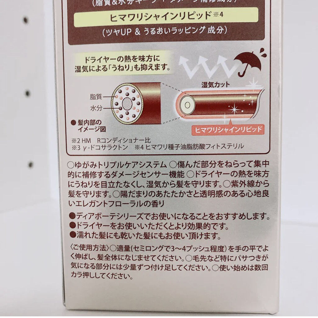 - ※2024年9月30日、リニューアル。 ●髪のゆがみ*1をケアして、素直な髪へ導くヘアケアブランド ●毛先までしなやかなうるおい続くミルクタイプの洗い流さないトリートメント ●濃厚ミルキー処方 ●素直で扱いやすい髪へ導くゆがみ*1ケアシステム ●ダメージ補修&保湿成分「高濃度*2プレミアムヒマワリオイルEX*3」配合 ●熱を味方に毛髪と結合し、髪の外側をコート ●浸透サポート成分(セバシン酸ジエチル)配合で、成分を髪内部に素早く浸透 ●ブローひっぱりケア ●「ヒマワリシャインリピッド*4」を配合した「ツヤうるラッピング」 ●ヒートプロテクト ●UVカット ●静電気防止 ●陽だまりのあたたかさと透き通ってさわやかなエレガントフローラルの香り *1:うねり・くせ・パサつきの原因となっている髪内部の水分と油分のバランスの乱れと外側のキューティクルの不均一なはがれのこと *2:HM RコンディショナーA比 *3:オーガニックヒマワリオイル、ヒマワリ種子エキス、ヒマワリ花エキス *4:ヒマワリ種子油脂肪酸フィトステリル(うるおい成分)