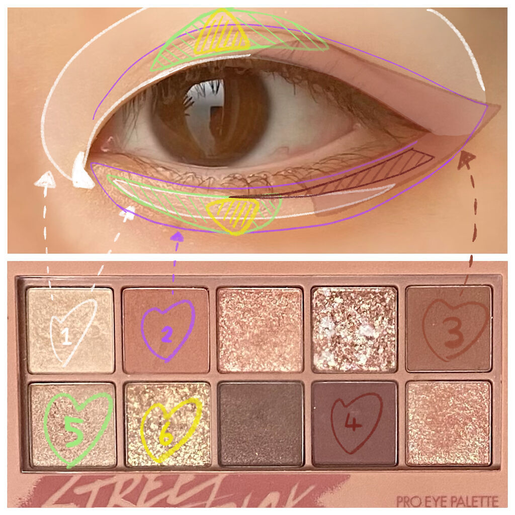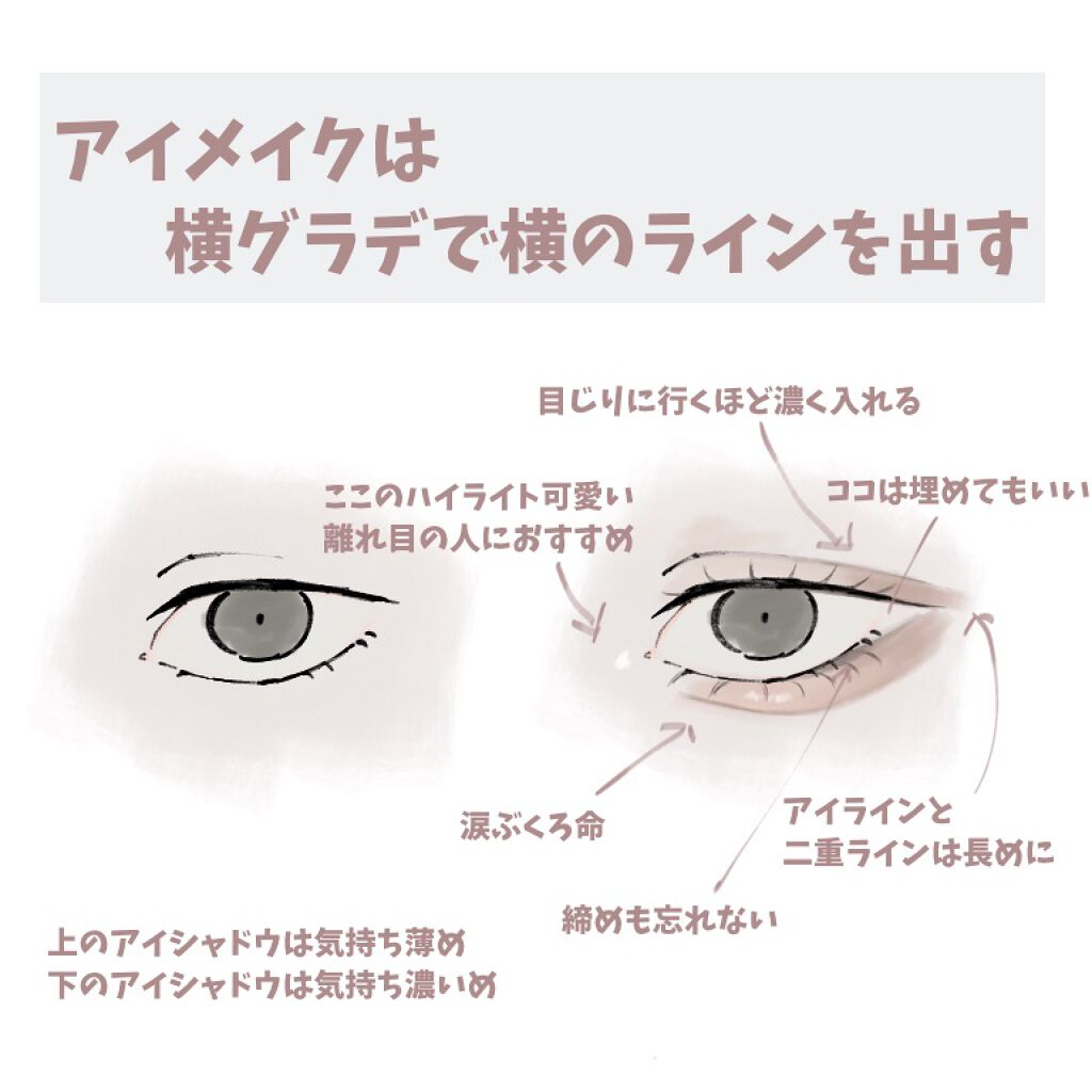 面長さんのアイメイクのコツは、横グラデを意識することと、涙袋のメイクを意識することです! ②目の二重幅と涙袋に色をのせます ✨ココ重要✨涙袋にも色をのせないと目の上のアイメイクの印象が強くなって余計に面長に見えるので注意しましょう ④目の下きわ(地雷線の辺り)に濃い色をのせて、目の下の印象を強くします ✨ココ重要✨これがあるかないことでは目が下にあるような効果が全然違います ⑤明るいラメをのせて立体感を出します 涙袋にものせてしっかり涙袋を演出しましょう ⑥大きなグリッターをのせて目のキュルキュル感を出します
