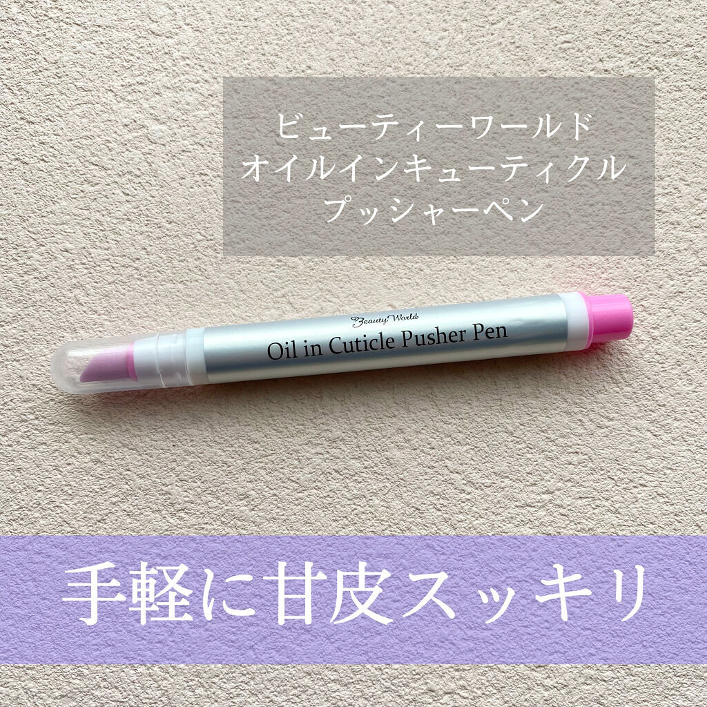 ネイルケア💅🏻で、甘皮処理が簡単に出来そうなので買ってみた✨ビューティーワールドオイルインキューティクルプッシャーペン¥605〜斜めにカットしてあるから、爪の根元にフィットして、使いやすかった!じんわりとオイルが染み出てくる感じです。甘皮部分...