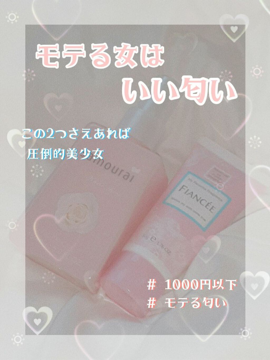 〜モテる女の匂いは、1000円で作れます〜 個人的意見…史上最強!? モテること間違えなしの匂いグッズで 圧倒的美少女♡ ✼••┈┈••✼••┈┈••✼••┈┈••✼••┈┈••✼ こんにちは〜みみです🐷 今日は、1000円で買える 私的に史上最強だと思われる匂いグッズを ご紹介します〜!! ✼••┈┈••✼••┈┈••✼••┈┈••✼••┈┈••✼ 〇商品紹介 1つ目の商品は…… 💗〘フィアンセハンドクリーム ピュアシャンプーの香り〙💗 きましたフィアンセ様。 もういい匂いと言えばフィアンセ様になってきています(( こちらの商品は、Amazonで550円でした!! ざっくり言うと…絶対モテる匂いです。 ピュアシャンプーの香り。本当にそのまんまのいい香り♡ シャンプーらしい爽やかな香りに、プラスして 女の子らしい甘みのある香りがなんとも良い!! これは万人受けする!! しかもハンドクリームだから、学校に持っていっても問題なし!! パッケージまで可愛いので持ってるだけで女子力up⤴︎ ⤴︎⤴︎ さらに、ハンドクリームの成分までこだわっていて 3種のシアバターが配合されているおかげで しっとり柔らかな手肌にしてくれるんです♡ なのにベタつかない!! 最高の商品です。 ✼••┈┈••✼••┈┈••✼••┈┈••✼••┈┈••✼ 2つ目の商品…… 💗〘サムライウーマンホワイトローズ フレグランスミスト〙💗 サムライウーマン様は本当にコスパが良い(T ^ T)♡ こちらの商品はAmazonで540円でした!! 150mlで540円は コスパ最強です。 ブルーも人気商品だったので迷いましたが、 ピンクを購入したところ 女子の匂いだぁーーーーーー!! 髪サラサラで肌白くて可愛い美少女の匂いです。 香水とは?って感じで もう、シャンプーの匂いがふわふわ香る♡ 髪の毛にも使えるということで 髪の毛に着けたら もう完璧お風呂上がりの女子。 学校に着けて言ったら友達に 「シャンプー変えた?いい匂い」 「朝シャンしてきた??」 「ずっと一緒にいたい匂い」 などと、大好評!! 兄にも 「サッパリしてて好きな匂い」 なんて言われました!! 男性ウケもよろしいかと♡ ただ、難点が1点。 大容量てわけで、サイズが大きくて持ち運びがちょっとって感じです。 でも、ダイソーの香水ボトルとかに入れたら完璧!! パッケージがシンプルなのに超可愛いので インテリアとしても使えちゃう♡ ✼••┈┈••✼••┈┈••✼••┈┈••✼••┈┈••✼ こんな感じです。 どちらもお手頃価格で 二つ買っても約1000円!! 私 結構匂いフェチなので匂いにはこだわるんですが この2つは私史上最強でした(T ^ T)♡ 是非買ってみてください!! みんなでモテ女になっちゃお♡ ✼••┈┈••✼••┈┈••✼••┈┈••✼••┈┈••✼ 最後まで見てくれてありがとう〜 また次の投稿で会いましょう!!