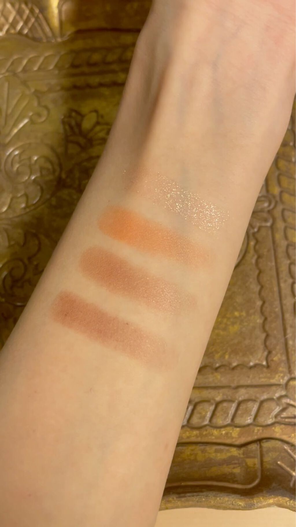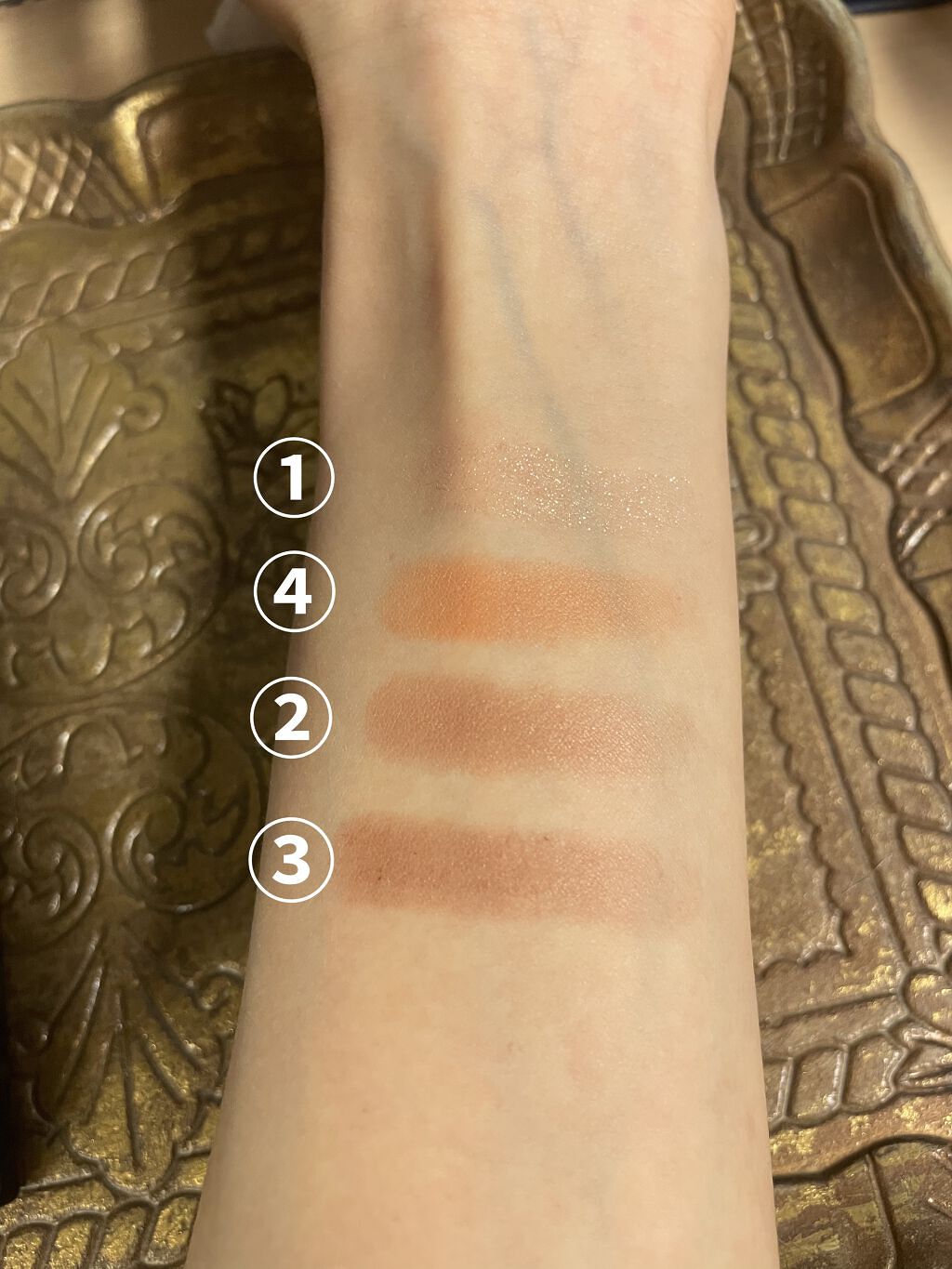 まず、配色が素晴らしい‼️ 温かみのあるオレンジブラウンと言うことで、秋を彷仏させる配色になっています。 ④のカラーは、オレンジにブラウンが入ったようなお色なので目が腫れぼったく見えません。 また、①のカラーはラメカラー・②③④のカラーはマットなので、使えば自然と目に奥行きが出ます。 また、粉質もめちゃくちゃいい!! 柔らかくてしっとりした粉なのでとても肌に馴染みやすく、色もちも良いです。 マットカラーのみで仕上げてお仕事に、ラメを使ってデートや女子会に。 イエベさんにお勧めしたいパレットです。 汎用性の高いお値段以上のコスメだと思います。