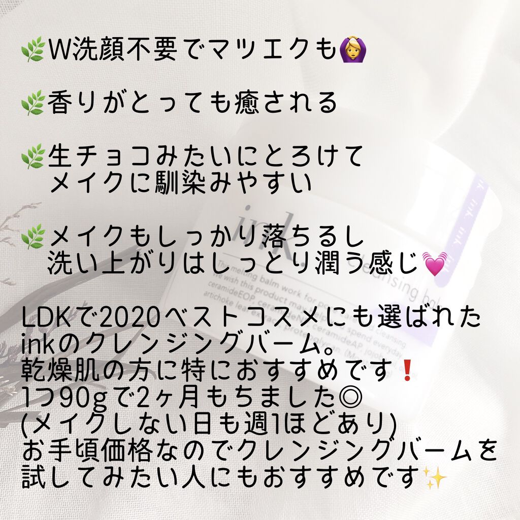 🌿W洗顔不要でマツエクも🙆♀️ 🌿香りがとっても癒される 🌿生チョコみたいにとろけて メイクに馴染みやすい 🌿洗い上がりがしっとり潤う感じ💓 LDKで2020ベストコスメにも選ばれた inkのクレンジングバーム。 乾燥肌の方に特におすすめです❗️ 1つ90gで2ヶ月もちました◎ (メイクしない日も週1ほどあり) お手頃価格なのでクレンジングバームを試してみたい人にもおすすめです✨