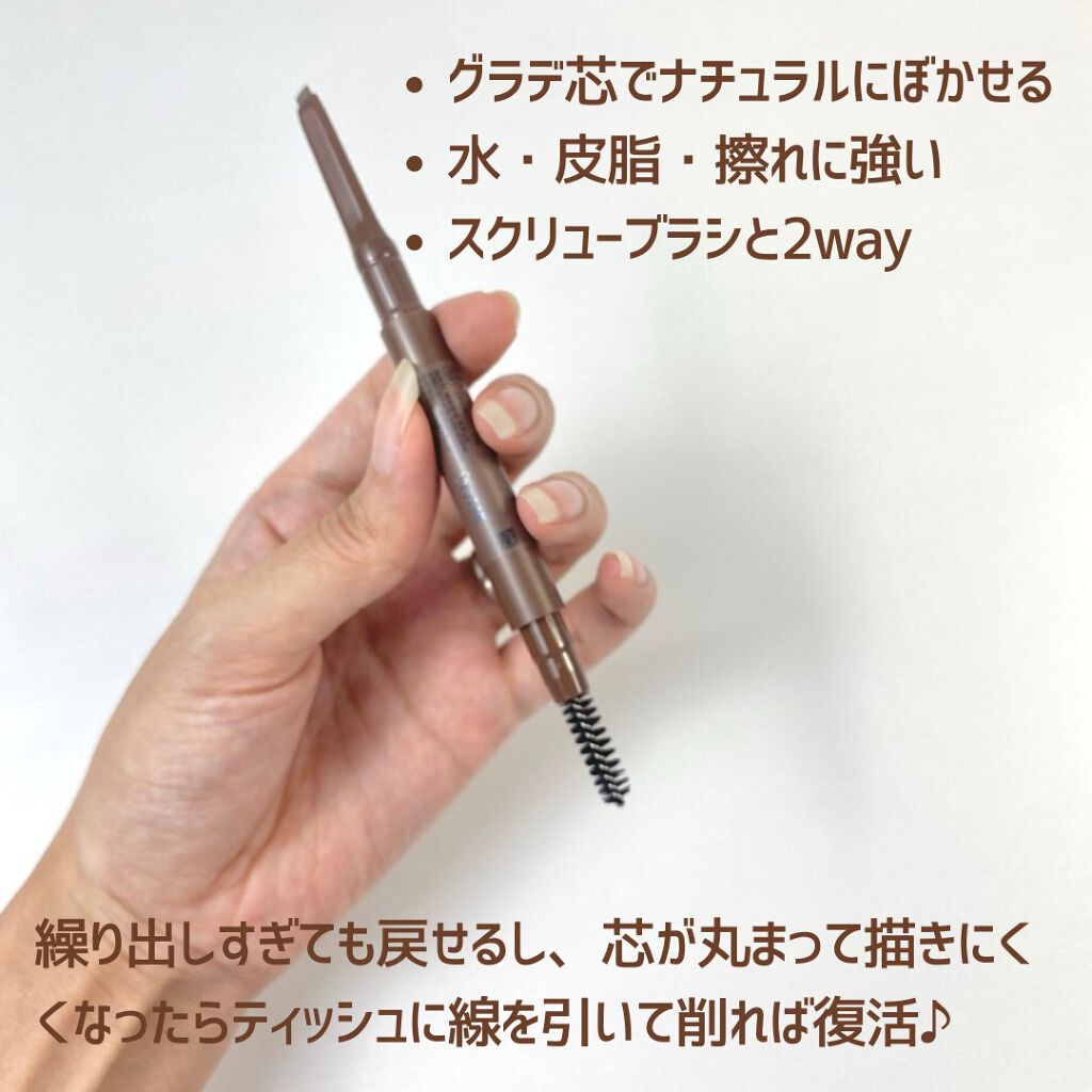 - 描き足しながらぼかせる。 ペンシルとパウダーを一つの芯にまとめた 2層芯アイブロウ ●しずく型2色グラデ芯で、自眉となじむ自然な仕上がり ー角の濃いカラーで、1本1本毛を描き足せるような細いラインを実現 ー面の淡いカラーで、自然にぼかしたような仕上がりを実現 ●毛流れを整え、自然になじませるスクリューブラシつき ●ウォータープルーフ処方 ●汗、皮脂、こすれに強く、美しい仕上がりが長時間持続 ●トリートメント成分配合 ースクワラン ●無香料 ●アレルギーテスト済(すべての方にアレルギーが起きないというわけではありません) <使い方> ●芯を2mm程度繰り出してお使いください。 ●芯の角で眉毛を1本1本描き足し、眉頭や輪郭は芯の面の部分でなじませるようにぼかします。 ●芯の出しすぎや落下などの衝撃により折れることがありますのでご注意ください。 ●ご使用後は、芯をもとにくり戻しキャップをきちんとしめてください。 ●ブラシはいつも清潔にしてお使いください。 ●日のあたるところや高温のところにおかないでください。 ●まれに芯の表面に白い粉のようなものがみられますが、品質上問題はありません。
