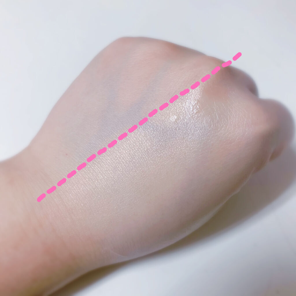 全体的にパール感があってツヤ肌に見せてくれます。 3枚目の写真、点線で区切って塗ってない部分と比べてツヤツヤしてますねこれ…! 朝顔を洗って化粧水つけて日焼け止め塗ってが億劫でしたがこれつければメイクめんどくさい日とかは全然OK👌 ただカバー力はそんなにないので毛穴やシミは消えません… 色も薄づきなので頬の赤みもあまり消えませんでした。 ほうれい線がパールの反射で消えたのはびっくりしましたね😆 今の仕事のメイクはうっすーいのでこれで充分でした。 マスク移りもほぼなく、パウダーをはたく必要もないようなのでズボラ人間にはありがたい🙏 ノーファンデ派の方には充分使える商品だと思います。
