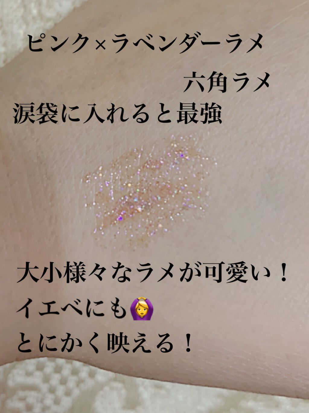 涙袋に塗ってからすぐにヒリヒリと熱を持った感じになって痛痒くなってしまいまして… 粘膜に塗ってしまったのかと思って 上瞼にも塗ってみましたが… やはりヒリヒリ。 ラメが最高に可愛いのに… 悲しいけれど私には合わなかったです…🥲 地道な作業になりますが、髪につけると大小様々なラメが光って可愛いです。 肌は弱いほうですが、そこまでデリケートじゃないと思っていました… 海外コスメは買う時に下調べが必要だと考えさせられる体験でした。。