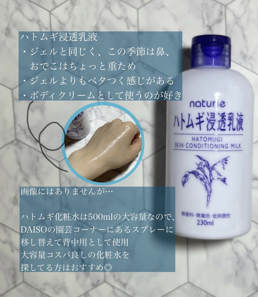 さっぱりとした使用感のハトムギ化粧水と、みずみずしい使用感のハトムギ保湿ジェル🩵 「ハトムギ化粧水」は、化粧水・ローションパック・プレ化粧水・ボディ化粧水…「ハトムギ保湿ジェル」は、メイク前の保湿ケア・フェイス&ボディの保湿・ジェルパック…など使い方いろいろ❣️ べたべたしなくて使いやすいし、たっぷり入っててコスパ◎✨