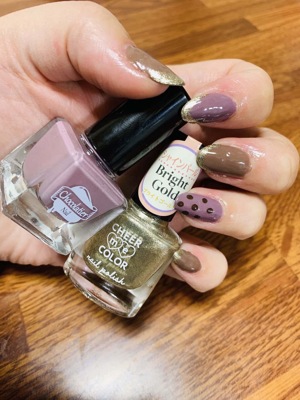 🌟今週のネイル🌟今週は100均だけのネイルです!使用したのはSeriaから新しく発売されたTMショコラティエネイルのミルクチョコラベンダーチョコビターチョコと同じくSeriaで購入したCHEERmeCOLORネイルポリッシュのブライトゴールド...