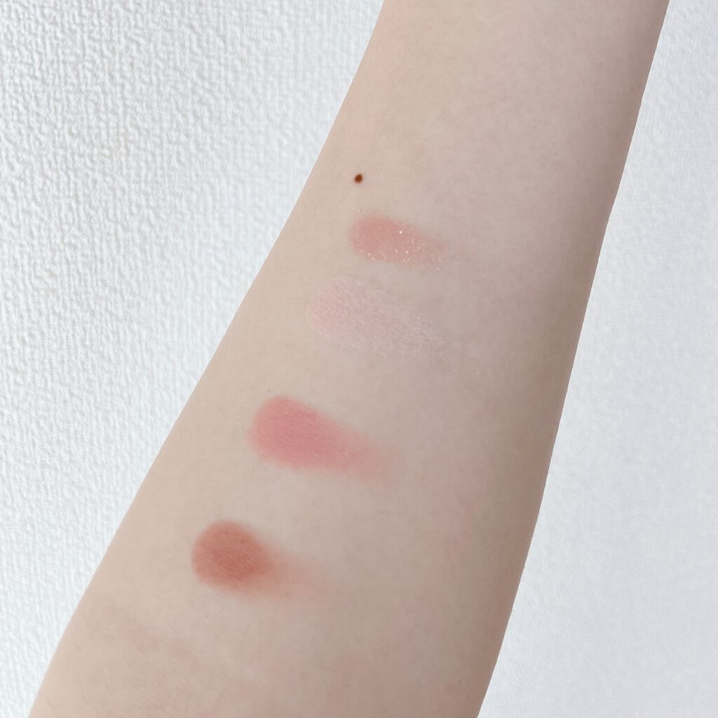 🎨まずベースのカラーはぜんっぜん違います‼️ かわいらしいくすみピンクからベージュぽいお色味に変更されました ここは大きく差はないように見えますが、 新作では黄味が少しプラスされた茶色のお色味になってます…。 旧作のこの黄味の少ないお色味が使いやすくて大好きだったので少しショックです😭 🎨次にアクセントカラー このカラーも塗った感じそんなに変更ないかなと思ったんですが、ちょっと赤味が増した感じがします。 濃いくすみピンクがかわいかったけどこれはこれでありなのかも?? 🎨次にアイブロウに使える締めカラー このカラーは私は眉毛に使っていて写真見づらくてごめんなさい!! こちらは赤味が少しプラスされたように感じましたがあまり大差がないように感じました! 🎨最後にアイライナーに使える締めカラー こちらは旧作だと赤味が少し足されたブラウンのお色味ですが新作だとどちらかというと黄味のないブラウンのお色味に感じました!