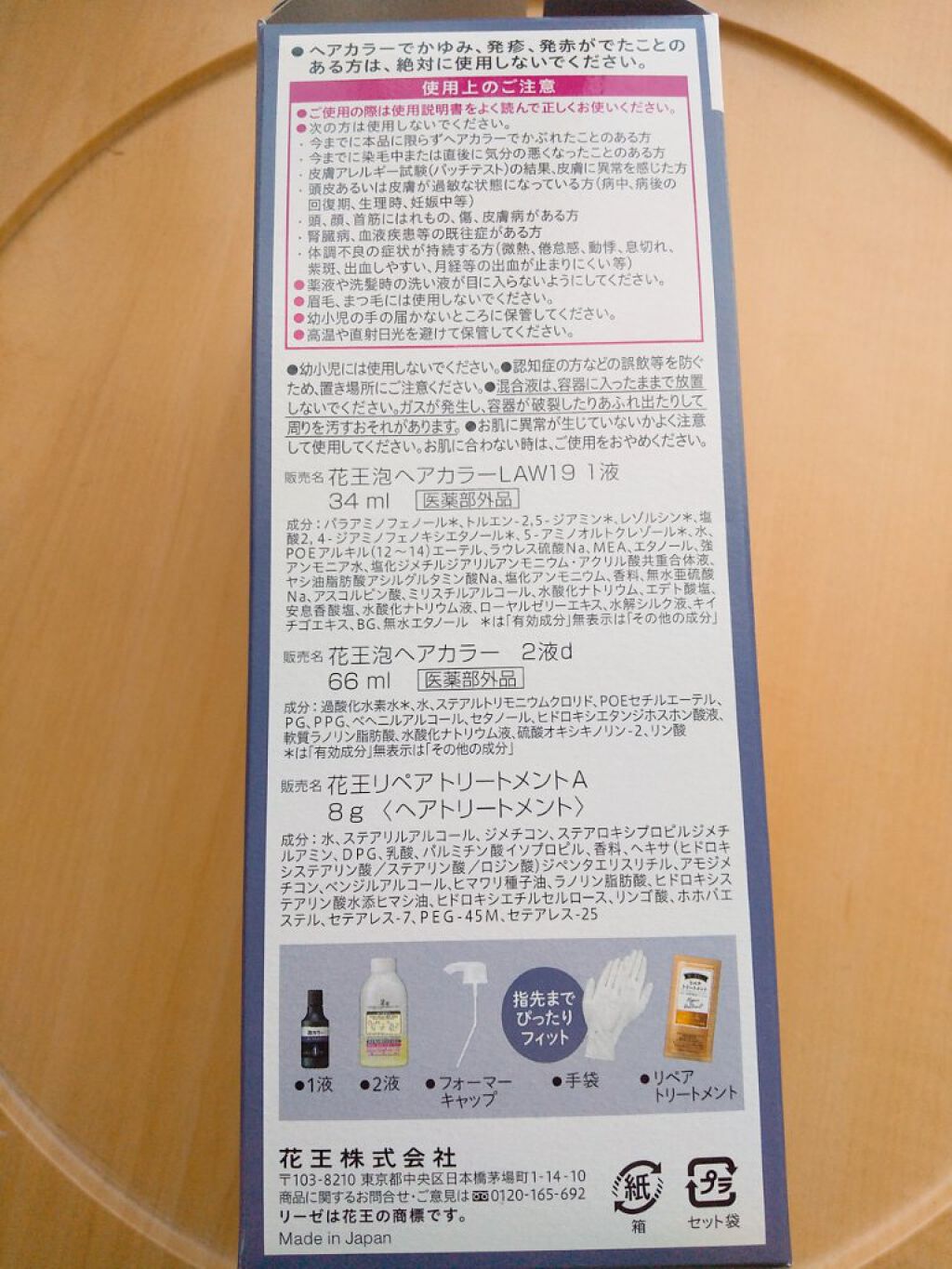 - 【医薬部外品】 【黒髪用ヘアカラー】 泡で簡単! 濃密泡が染まりにくい根元や見えない後ろにもしっかり密着して、ムラなく美しい仕上がりを実現。 透明感とやわらかさを表現するために、グレーやブルーの色味をブレンドした「サロン発想」の色設計。 毛髪保護成分*配合。指通りなめらか、しっとり質感の染め上がり。 *水解シルク液、軟質ラノリン脂肪酸 アフターカラー用リペアトリートメント(化粧品)つき。 ●セミロングヘア(肩から脇の下くらいの長さ)1回分 ●1回使いきりタイプ ●白髪用ではありません ※使用上の注意をよく読んで、正しくお使いください。 ※ヘアカラーでかゆみ、発疹、発赤がでたことのある方は、絶対に使用しないでください。