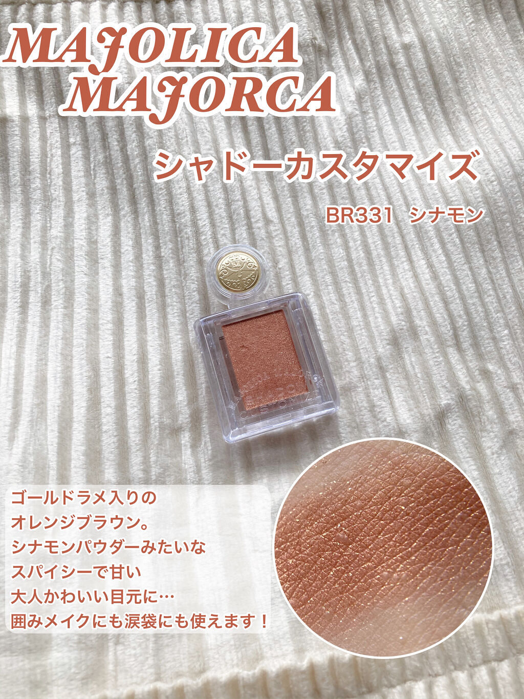 \\これイエベさんに絶対おすすめなカラー♡時短にも♡//MAJOLICAMAJORCAのシャドーカスタマイズ¥550で買えるのは神すぎる。しかもドラストで普通に買えるのも🙆♀️◎BR331シナモンはオレンジブラウンにゴールドラメがめちゃくち...