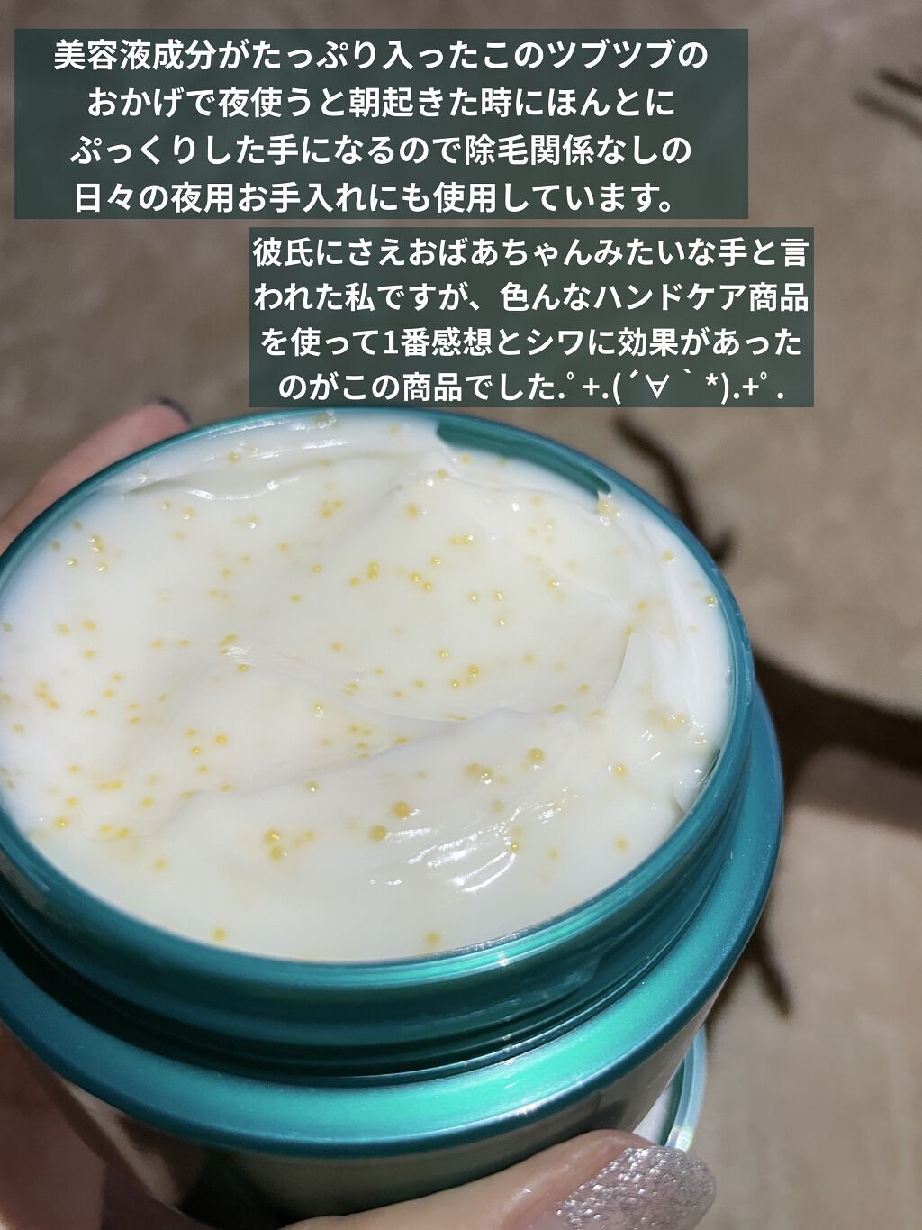 - こっくり濃厚なクリームに、たっぷりの美容液成分がぎゅっと詰まったカプセルを配合。 おやすみ前にマッサージするように手肌にぬりこむと、カプセルが崩れて美容液成分※1が肌に広がります。 夜美容で、寝ている間にじっくり角層に浸透、翌朝ふっくらうるおったハリのある手肌に。 さらに気になる爪・指先までうるおって美しく。ドリーミーアロマの香り。 ※1ローヤルゼリーエキス&パンテノール(保湿成分)