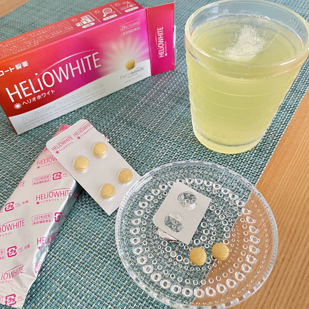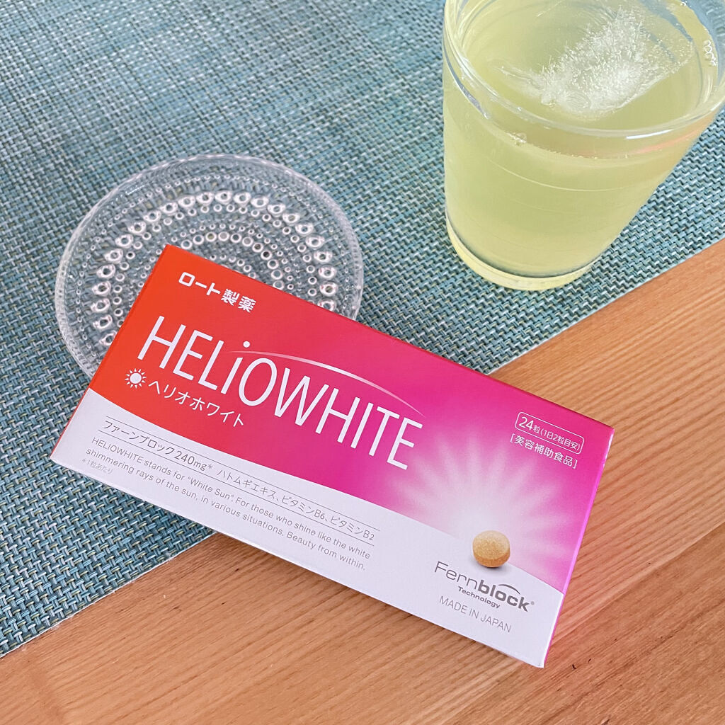 - スペインのカンタブリアラボ社が保有し、世界59カ国以上で発売されている※1「ファーンブロック(Fernblock)※2」。ヘリオホワイトは、その「ファーンブロック 240mg★」に加え、美容サポート成分(ハトムギエキス、ビタミンB6やビタミンB2)を配合した日本国内製造の美容補助食品です。 海やスポーツ、レジャーなど様々なシーンで輝くあなたに。飲む美容習慣。 錠剤の直径は1cm。携帯にも便利なシートタイプのPTP包装。 1日2粒を目安に、かまずに水などでお召し上がりください。