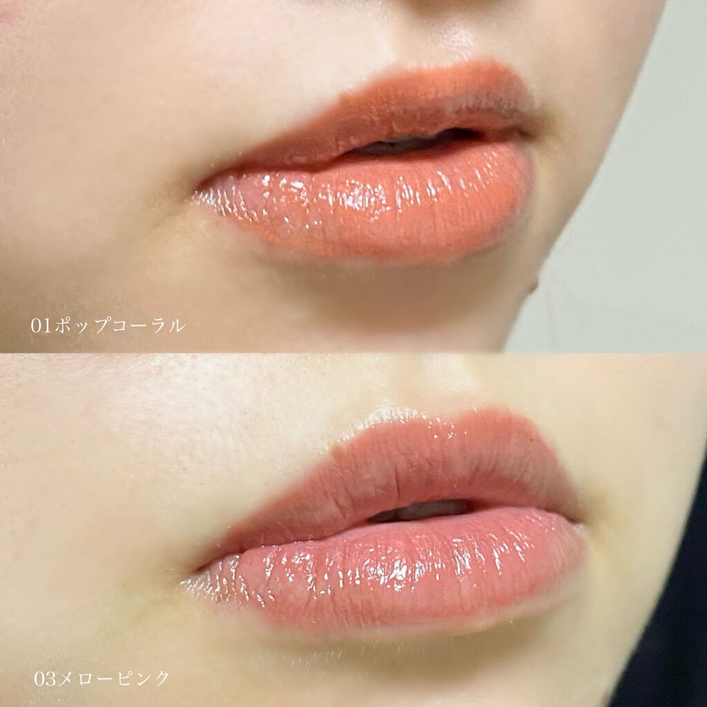 全体的に言えるのは、とにかく保湿されている感があるので、乾燥は気になりませんでした! 1度塗りでも綺麗な発色で、ツヤツヤしています。 きりまるちゃんおすすめの塗り方は、メイクの途中で塗って数分置くことみたいです。そうすると、色持ちがよくなるようです。 色味はとっても可愛いです♡ こちらのメローピンクは使いやすかったです!