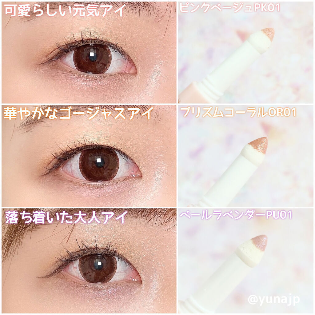- 塗るだけメイク映えの涙袋アイカラー。 パール効果で白目をクリアな印象に導き、ぷっくりうるんだ大きな目元を演出。 涙袋にフィットするやわらかパフチップで塗るだけで、たて目幅がグンとUPしてみえます。 汗・皮脂に強いウォータープルーフタイプで長時間涙袋をキープします。 メイクキープ成分配合で、先に塗ったアイライナーやマスカラのにじみを防ぎ、長時間パンダ目をブロックします。 OR01 プリズムコーラル:目元にアクセント、プリズムコーラル。 PK01 ピンクベージュ:自然になじむピンクベージュ。