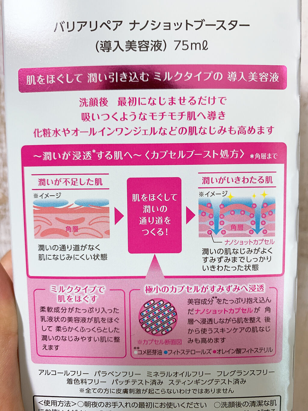 - 洗顔後、化粧水前のひと塗りで、肌の角質層中の奥まで浸透して潤いを引き込む導入美容液。柔軟成分がたっぷり配合された伸びなじみのいい乳液状の美容液で、ごわつきがちな肌を柔らかにほぐし、潤いのなじみやすい肌に整えます。美容成分をたっぷり抱え込んだ最小クラス※1のナノショットカプセルが、角質層を整えることで、後から使うスキンケアの肌なじみを高めます。アルコールフリー。※1 メーカー従来品比