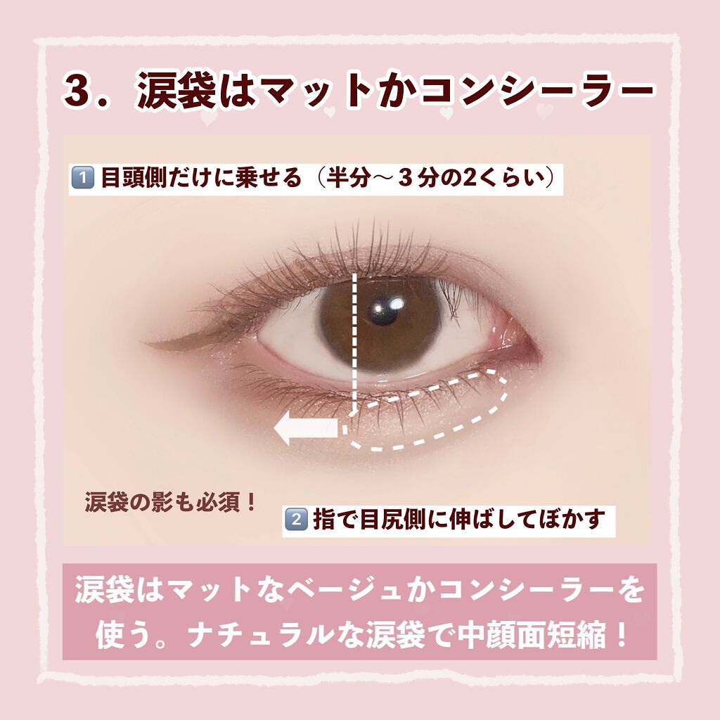 ・涙袋の影の部分まで、ベースを塗ることで縦幅がかなり強調されて丸目にみえる! ・アイシャドウの陰影とラメのハイライト効果で奥まった目に光を取り込んで出目っぽくみせる! ・淡いピンクのアイシャドウ、艶のようなラメ、細くて短いブラックアイラインが特徴 ・つり目を自然にいかせて、美人な雰囲気になれる! ・単色メイクは簡単そうに見えて難しいけど、ブラシを使うと綺麗なグラデーションになる! ・目の形によって中間色をどこまで入れるか変わるけど「目を開けた時に5mm見える」を基準にする
