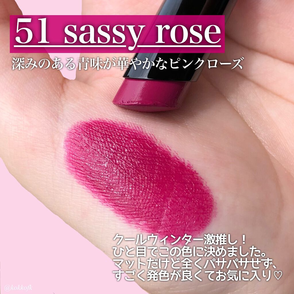 - 鮮やかな発色と艶やかなうるおいが続く、 5質感、51色のリップスティック。 スキンケアのカプセル技術を応用した2種のカプセル(ハイドロステイカプセル・カラーホールドカプセル)を配合。うるおいと彩りが心地よく続き、スキンケアで丁寧に仕立てられたような上質な唇をうみだすスキンケアルージュです。 5質感51色 5つの質感⇓ ・Shine(高ツヤ)タイプ 透明感と光に満ちた艶感のある仕上がり ・Glow(ツヤ)タイプ うるおいに満ちた濡れ艶感のある仕上がり ・Satin(セミツヤ)タイプ 質なうるおいと唇本来の艶感のある仕上がり ・Velvet(セミマット)タイプ やわらかなうるおいを抱えたソフトマットな仕上がり ・Matte(マット)タイプ 光をはらんだようなパウダリーマットな仕上がり
