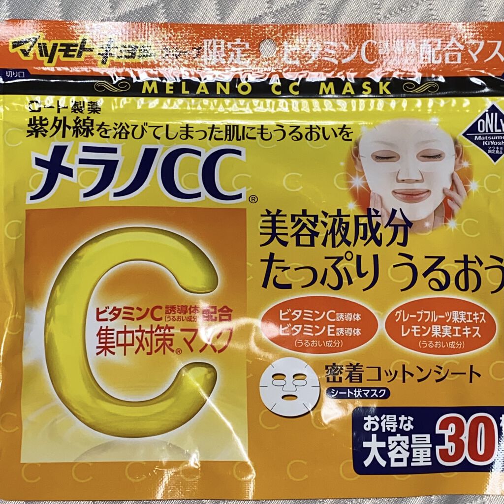 - 紫外線を浴びてしまった肌にもうるおいを。 美容液成分たっぷりうるおう、お得な大容量 「メラノCC 集中対策マスクMK」は、うるおい成分「ビタミンC誘導体(うるおい成分)」「ビタミンE誘導体(うるおい成分)」を配合したフェイスマスクです。 天然コットンシートを採用。 毎日のケアに使いやすい大容量30枚入り。 化粧水などで肌を整えた後にお使いください。美容液・乳液・クリーム等は、マスク使用後にお使いいただけます。 ロート製薬とマツモトキヨシホールディングスとの共同企画