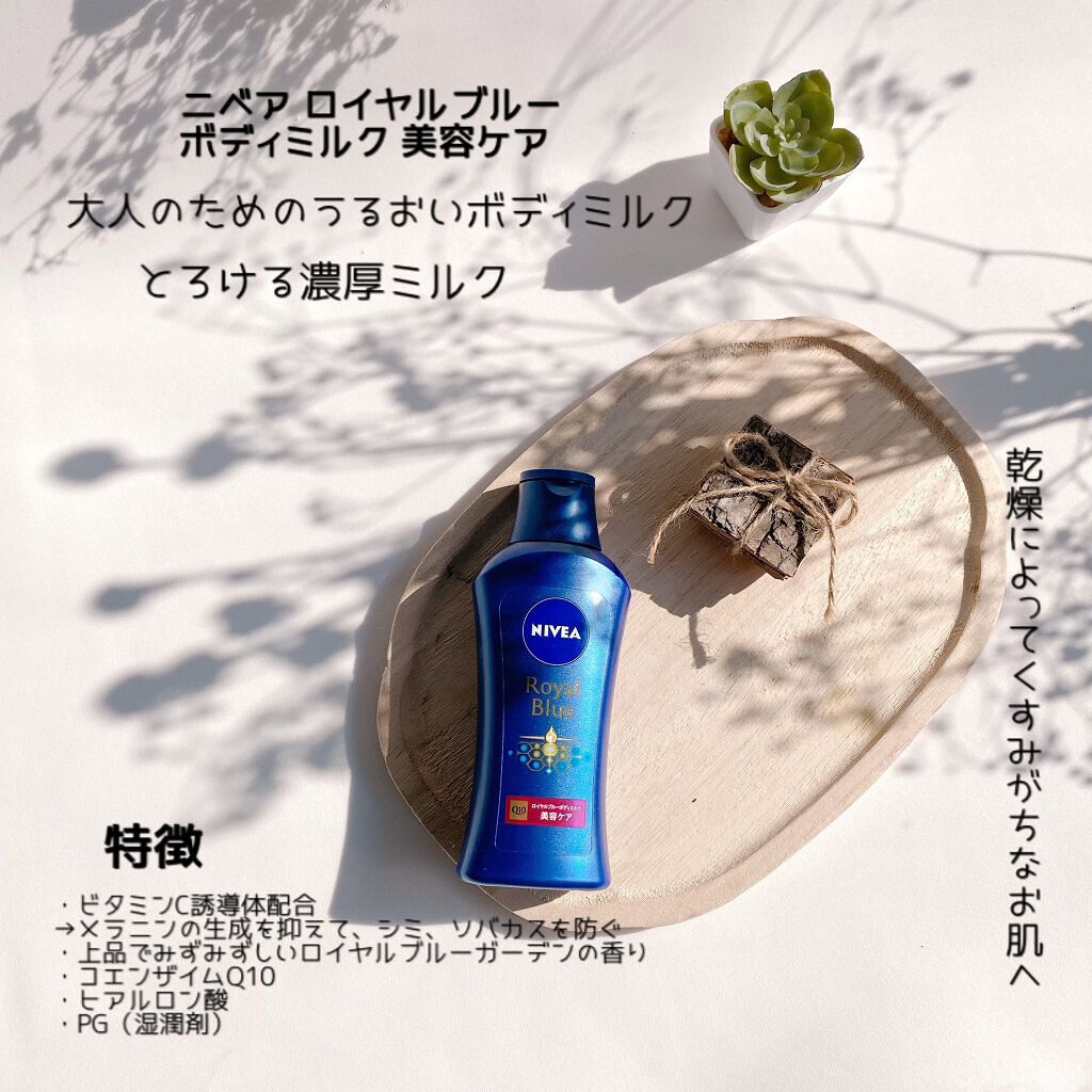 ロイヤルと名前がついているだけあって、高級感があり、ニベアのシリーズでもワンランク上の印象です✨ ベタつかないのに、高保湿なので、ふくらはぎなんかも、恥ずかしながら乾燥がひどく粉をふいたりしてたのも、しっとりとした肌になりました! 角層うるおい成分にセラミド、美白成分にビタミンC誘導体配合、コエンザイムQ10、ヒアルロン酸も配合されているので、シミ、そばかすの予防や、ハリの低下、乾燥によるくすみが気になる方などにもぜひ使ってもらいたいです✨