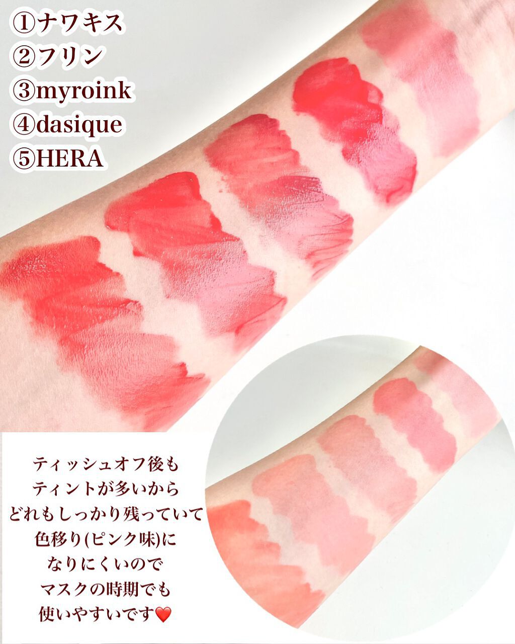 ウォータージェルテクスチャーで長時間にじまないティントとのことで、塗り心地は良く、染まるような発色でした😳 くすみのない明るいレッド系なので、顔色が明るくなって私に合うカラーでした🥰 透け感があると使いやすくて助かります😳