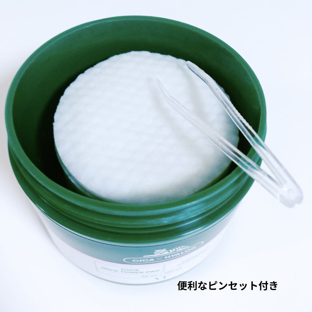 - <CICA マイルドトナーパッド> 水、グリセリン、BG、サリチル酸、ツボクサエキス、ヒアルロン酸Na、アシアチコシド、マデカッソシド、マデカシン酸、アシアチン酸、プロポリスエキス、ホソバニンジンエキス、ハマメリス葉エキス、セイヨウシロヤナギ樹皮エキス、アラントイン、β-グルカン、トロメタミン、コハク酸ジエトキシエチル、クロルフェネシン、ラウリン酸ポリグリセリル-10、ミリスチン酸ポリグリセリル-10、エチルヘキシルグリセリン、デキストリン、クチナシ果実エキス、EDTA-2Na、トコフェロール、プロパンジオール、ベタイン、グリチルリチン酸2K、香料、1,2 -ヘキサンジオール