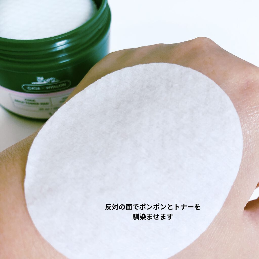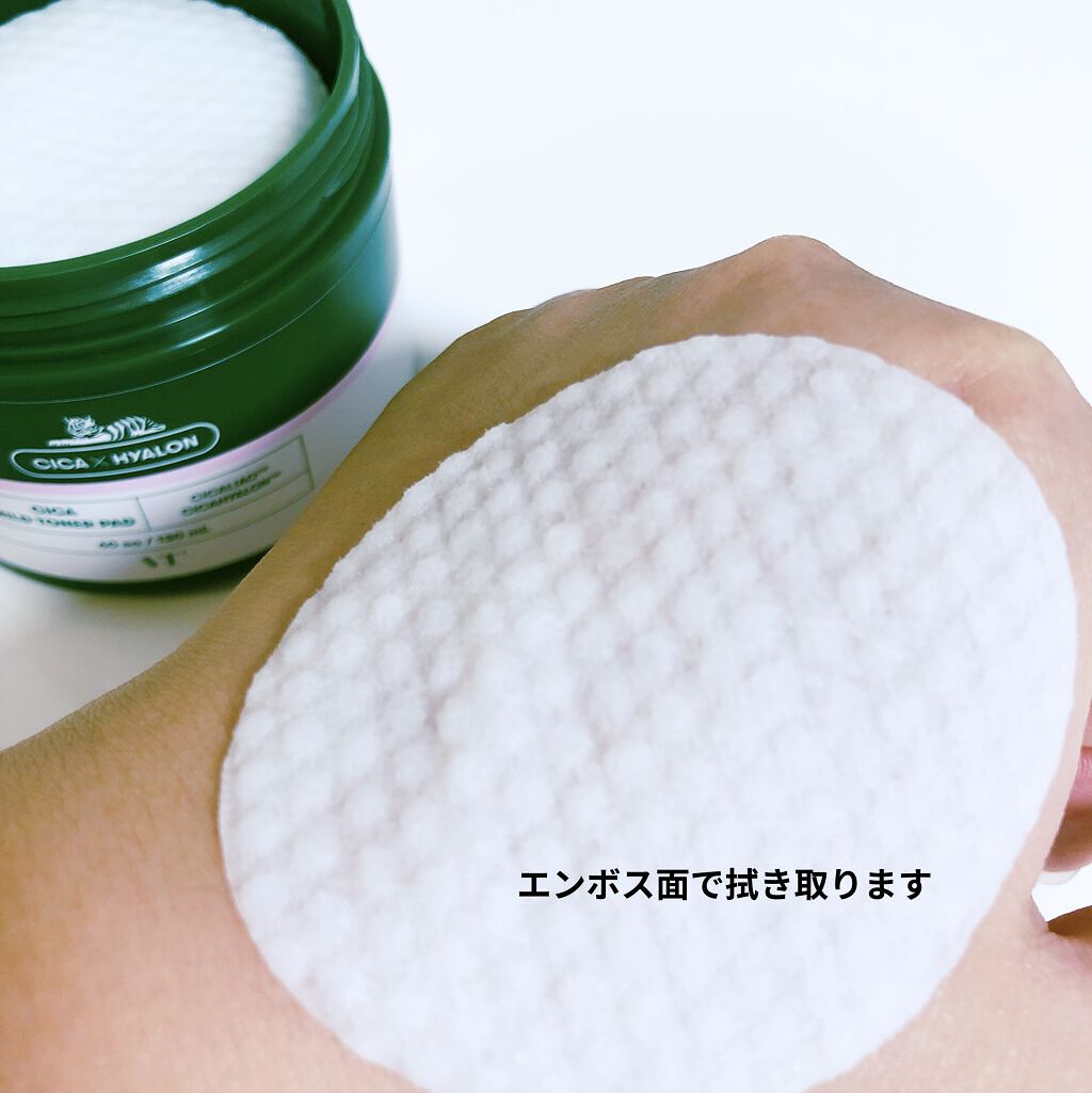 でこぼこのエンボス面で不必要な角質や毛穴汚れなどを拭き取れるトナーパッド! 朝ぬるま湯で顔を洗ってから、メイク前にトナーパットで拭き取るのが大好き🌟 夜のケアだと、赤みやポツポツニキビが気になる部分にパットを抑えて部分用パックとして使うのも好き!! VTのCICAはとにかく肌荒れが気になる時 (赤みやニキビ)に使用するのがおすすめ🌿💚