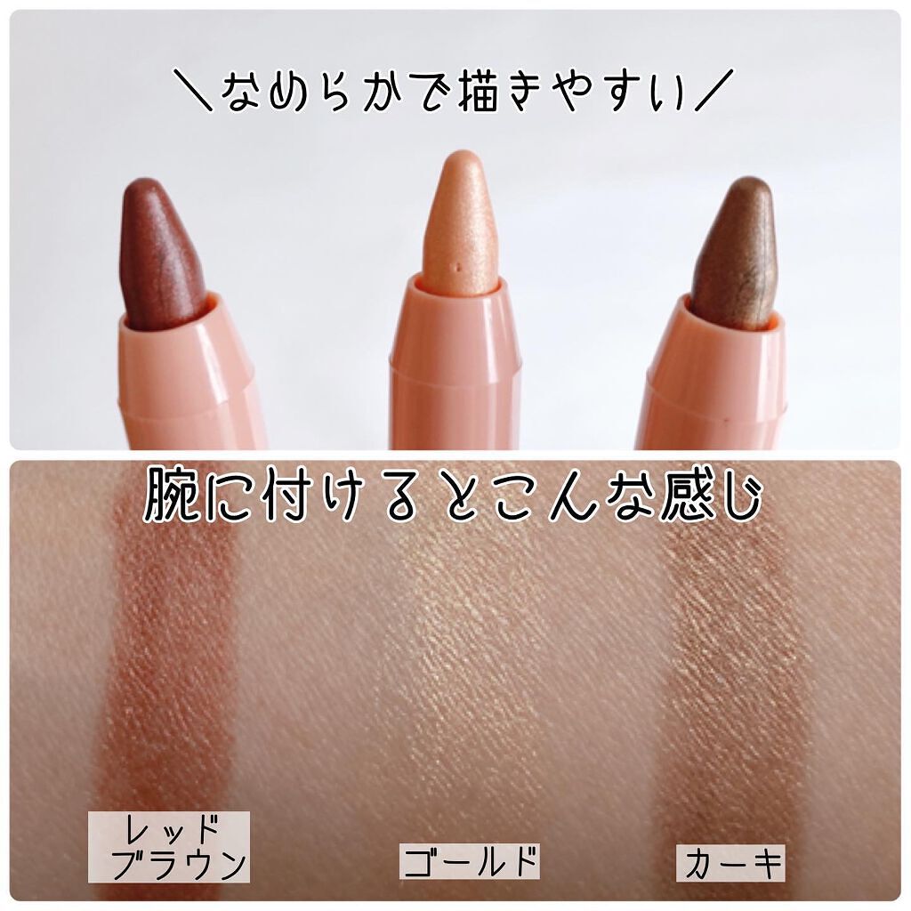 #ダイソーコスメ#アンドドット#アイシャドウスティック買ってみたよ👍✳️なめらかな描き心地のラメ入りアイシャドウこれは買ってよかった👍😍カラーはレッドブラウンというカラー🩷つけやすいカラーだし、色味も気に入った。細かい感じのゴールドっぽいラメ...