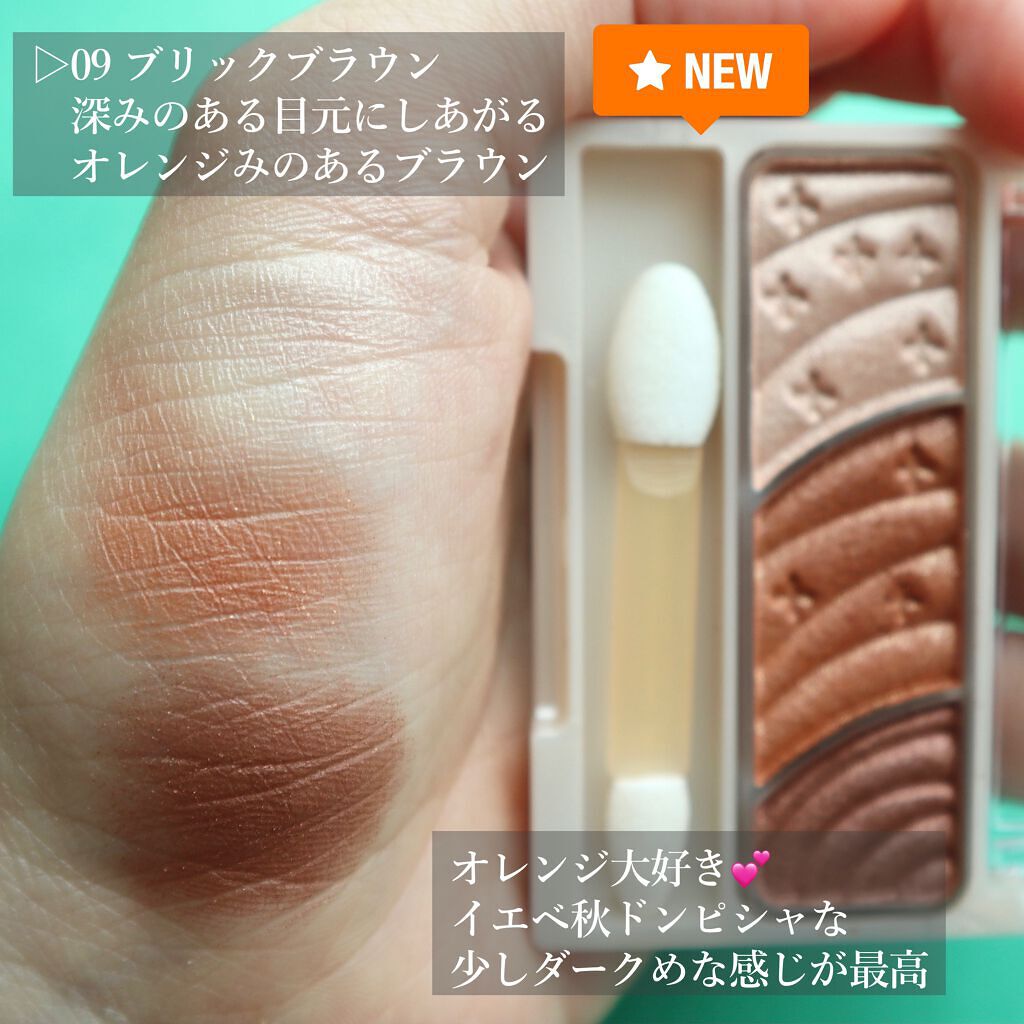 - 3色で簡単に明るく大きな目元に。 しっとり感触のアイシャドウ。 くすみを飛ばす明るさベース、ひとえ・奥二重の方でも幅広く塗れる肌なじみの良い中間色、 濃密高発色の締め色が目の輪郭を強調し大きな目元に。 微細パール配合でくすみを飛ばし、明るい目元へ。