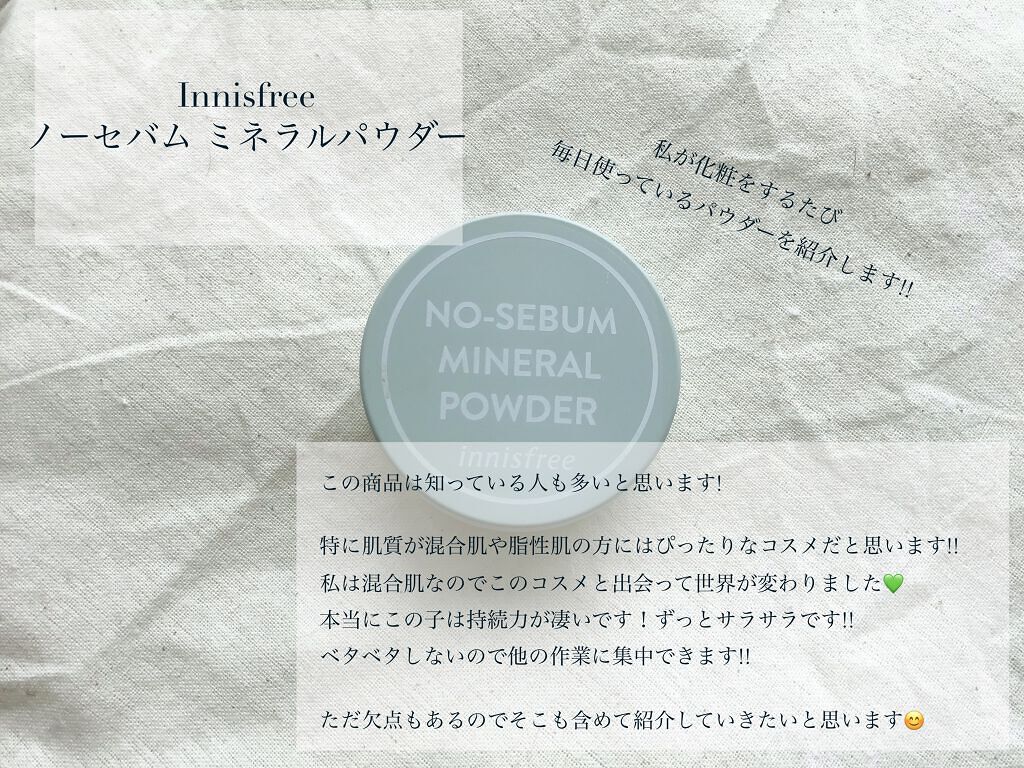 Innisfreeノーセバムミネラルパウダー本当にずっとサラサラで私はこのパウダーが大好きです🤍🤍🤍この商品は知っている人も多いと思います!特に肌質が混合肌や脂性肌の方にはぴったりなコスメだと思います!!私は混合肌なのでこのコスメと出会って世...