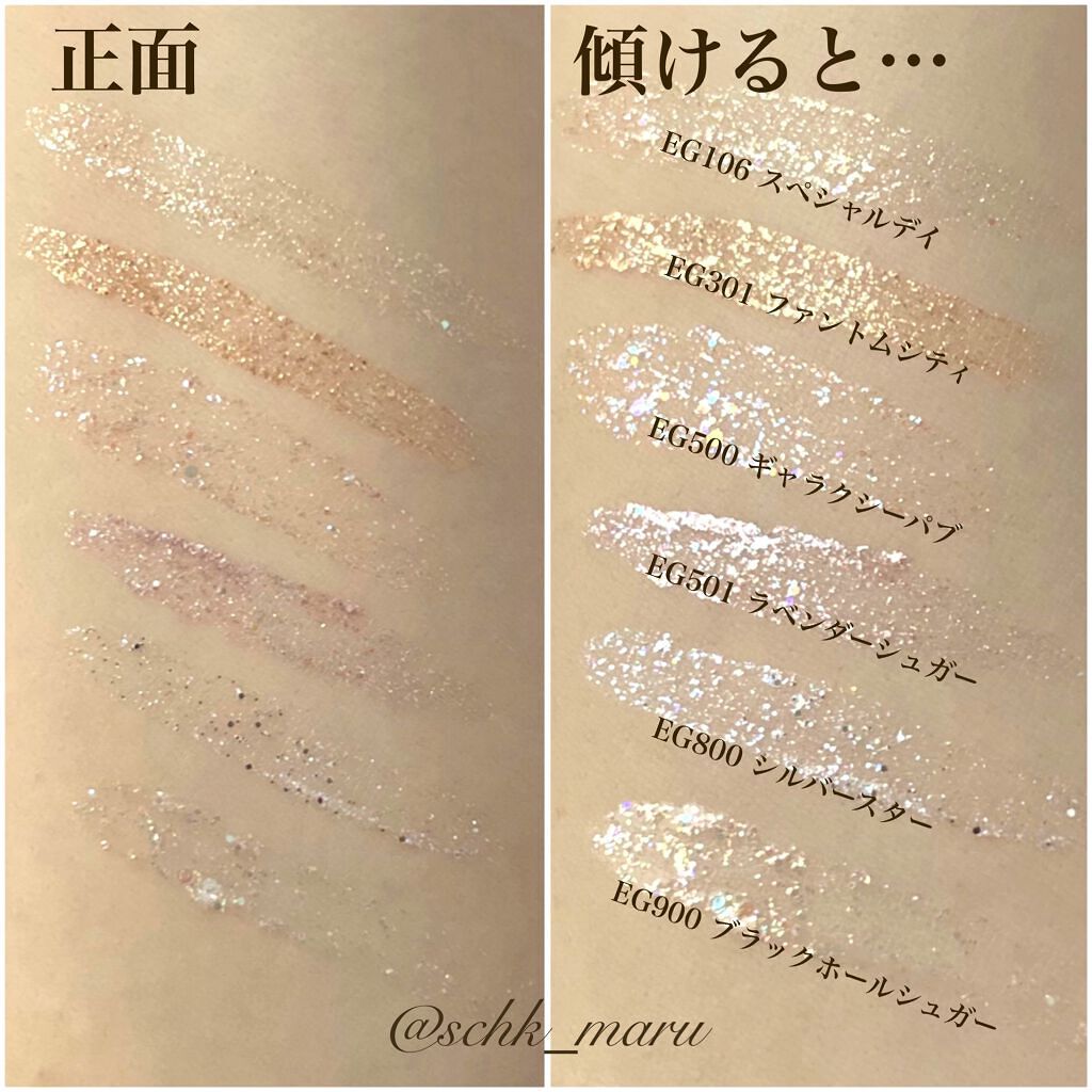 - EG106 Special day:水、マイカ、ケイ酸(Al/Ca/Na)、シクロペンタシロキサン、ホウケイ酸(Ca/Al)、ポリプロピルシルセスキオキサン、グリセリン、1,2-ヘ キ サ ン ジオール、ポリソルベート60、(アクリル酸ヒドロキシエチル/アクリロイルジメチルタウリンNa)コポリマー、アルギニン、カルボマー EG301 Phantom city:水、マイカ、ケイ酸(Al/Ca/Na)、シクロペンタシロキサン、ホウケイ酸(Ca/Al)、ポリプロピルシルセスキオキサン、グリセリン、1,2-ヘ キ サ ン ジオール、ポリソルベート61、(アクリル酸ヒドロキシエチル/アクリロイルジメチルタウリンNa)コポリマー、アルギニン、カルボマー EG500 Galaxy pub:水、マイカ、ケイ酸(Al/Ca/Na)、シクロペンタシロキサン、ホウケイ酸(Ca/Al)、ポリプロピルシルセスキオキサン、グリセリン、1,2-ヘ キ サ ン ジオール、ポリソルベート60、(アクリル酸ヒドロキシエチル/アクリロイルジメチルタウリンNa)コポリマー、アルギニン、カルボマー EG501 Lavender sugar:水、マイカ、ケイ酸(Al/ Ca/Na)、シクロペンタ シロキサン、ホウケイ酸(C a/Al)、ポリプロピルシ ルセスキオキサン、グリセ リン、1,2-ヘ キ サ ン ジ オール、ポリソルベート6 0、(アクリル酸ヒドロキシ エチル/アクリロイルジメ チルタウリンNa)コポリ マー、アルギニン、カルボ マー EG800 Silver star:水、マイカ、ケイ酸(Al/Ca/Na)、ホウケイ酸(Ca/Al)、シクロペンタシロキサン、ポリプロピルシルセスキオキサン、グリセリン、1,2-ヘ キ サ ン ジオール、ポリソルベート60、(アクリル酸ヒドロキシエチル/アクリロイルジメチルタウリンNa)コポリマー、アルギニン、カルボマー EG900 Black hole sugar:水、マイカ、ケイ酸(Al/Ca/Na)、シクロペンタシロキサン、ホウケイ酸(Ca/Al)、ポリプロピルシルセスキオキサン、グリセリン、1,2-ヘ キ サ ン ジオール、ポリソルベート60、(アクリル酸ヒドロキシエチル/アクリロイルジメチルタウリンNa)コポリマー、アルギニン、カルボマー