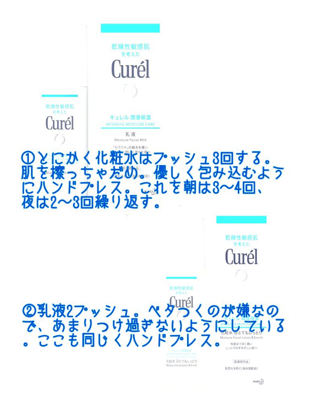 スキンケア備忘録。キュレルシリーズでライン使い、夜は豆乳イソフラボンのアイクリームで目元の保湿ケア。画像の通り、朝は潤浸保湿化粧水(IIIとてもしっとり)で、しっかり保湿。優しくハンドプレス。保湿した後は日焼け止めでUVローションSPF50+...