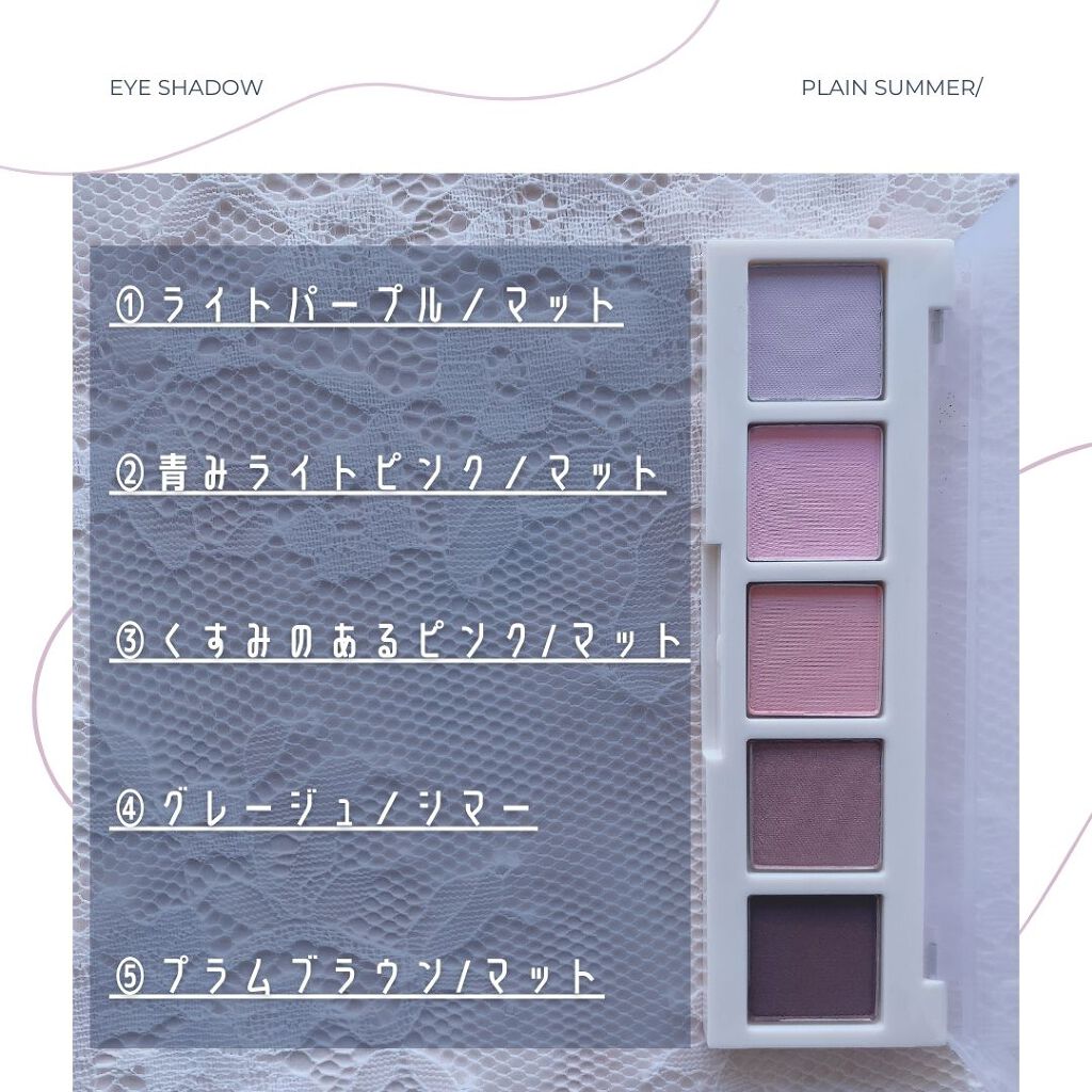 - #1 PLAIN SUMMER #A タルク、合成フルオロフロゴパイト、マイカ、シリカ、トリ(カプリル酸/カプリン酸)グリセリル、ミリスチン酸Mg、ステアリン酸Mg、グンジョウ、マカデミア種子油、ジメチコン、メチルプロパンジオール、ステアリン酸ジメチコノール、ジミリスチン酸Al、プロパンジオール、トリエトキシカプリリルシラン、水、酸化鉄、カルミン #B タルク、マイカ、酸化チタン、シリカ、ステアロイルオキシステアリン酸オクチルドデシル、フェニルトリメチコン、ミリスチン酸Mg、ステアリン酸Mg、メチルプロパンジオール、リンゴ酸ジイソステアリル、ヘキサ(ヒドロキシステアリン酸/ステアリン酸/ロジン酸)ジペンタエリスリチル、トリ(カプリル酸/カプリン酸)グリセリル、プロパンジオール、ジメチコン、トリエトキシカプリリルシラン、水添レシチン、メチコン、ラウロイルリシン、水酸化Al、水、赤226、グンジョウ、黄4 #C タルク、マイカ、酸化チタン、ナイロン-12、シリカ、ステアロイルオキシステアリン酸オクチルドデシル、フェニルトリメチコン、ミリスチン酸Mg、オクチルドデカノール、マカデミア種子油、ステアリン酸Mg、メチルプロパンジオール、(HDI/トリメチロールヘキシルラクトン)クロスポリマー、ジメチコン、リンゴ酸ジイソステアリル、ヘキサ(ヒドロキシステアリン酸/ステアリン酸/ロジン酸)ジペンタエリスリチル、プロパンジオール、ステアリン酸ジメチコノール、水添レシチン、メチコン、トリエトキシカプリリルシラン、水、カルミン、酸化鉄、グンジョウ #D タルク、マイカ、酸化チタン、ジエチルヘキサン酸ネオペンチルグリコール、マンガンバイオレット、ナイロン-12、フェニルトリメチコン、合成フルオロフロゴパイト、酸化鉄、ミリスチン酸Mg、リンゴ酸ジイソステアリル、ヘキサ(ヒドロキシステアリン酸/ステアリン酸/ロジン酸)ジペンタエリスリチル、ネオペンタン酸イソステアリル、ステアロイルオキシステアリン酸オクチルドデシル、ステアリン酸Mg、メチルプロパンジオール、ポリブテン、ジメチコン、プロパンジオール、シリカ、ラウロイルリシン、トリエトキシカプリリルシラン、水、酸化スズ、グンジョウ #E タルク、マイカ、合成フルオロフロゴパイト、酸化鉄、トリ(カプリル酸/カプリン酸)グリセリル、シリカ、マンガンバイオレット、グンジョウ、カルミン、マカデミア種子油、ミリスチン酸Mg、(ビニルジメチコン/メチコンシルセスキオキサン)クロスポリマー、メチルプロパンジオール、ジメチコン、ステアリン酸ジメチコノール、ステアリン酸Mg、プロパンジオール、水添レシチン、ハイドロゲンジメチコン、トリエトキシカプリリルシラン、水、赤226 #2 PLAIN WINTER #A タルク、合成フルオロフロゴパイト、シリカ、マイカ、トリ(カプリル酸/カプリン酸)グリセリル、ミリスチン酸Mg、ステアリン酸Mg、マカデミア種子油、ジメチコン、メチルプロパンジオール、トリエトキシカプリリルシラン、プロパンジオール、ジミリスチン酸Al、水、カルミン、酸化鉄、グンジョウ #B タルク、合成フルオロフロゴパイト、マイカ、シリカ、トリ(カプリル酸/カプリン酸)グリセリル、酸化チタン、グンジョウ、ミリスチン酸Mg、ステアリン酸Mg、マカデミア種子油、ジメチコン、メチルプロパンジオール、トリエトキシカプリリルシラン、プロパンジオール、ステアリン酸ジメチコノール、ジミリスチン酸Al、水酸化Al、水、酸化鉄、カルミン #C タルク、合成フルオロフロゴパイト、マイカ、シリカ、グンジョウ、トリ(カプリル酸/カプリン酸)グリセリル、ミリスチン酸Mg、ステアリン酸Mg、マンガンバイオレット、酸化鉄、マカデミア種子油、ジメチコン、メチルプロパンジオール、トリエトキシカプリリルシラン、プロパンジオール、ジミリスチン酸Al、ステアリン酸ジメチコノール、水酸化Al、水、酸化チタン、カルミン #D タルク、合成フルオロフロゴパイト、マイカ、シリカ、カルミン、トリ(カプリル酸/カプリン酸)グリセリル、ミリスチン酸Mg、ステアリン酸Mg、マンガンバイオレット、酸化鉄、グンジョウ、マカデミア種子油、ジメチコン、メチルプロパンジオール、トリエトキシカプリリルシラン、ジミリスチン酸Al、プロパンジオール、ステアリン酸ジメチコノール、水、青1 #E タルク、マイカ、酸化鉄、合成フルオロフロゴパイト、ホウケイ酸(Ca/Al)、オクチルドデカノール、シリカ、マンガンバイオレットトリ(カプリル酸/カプリン酸)グリセリル、グンジョウ、カルミン、マカデミア種子油、メチルプロパンジオール、ジメチコン、プロパンジオール、ホウケイ酸(Ca/Na)、ステアリン酸ジメチコノール、ハイドロゲンジメチコン、水添レシチン、トリエトキシカプリリルシラン、ミリスチン酸Mg、ステアリン酸Mg、水、酸化スズ、酸化チタン、赤226