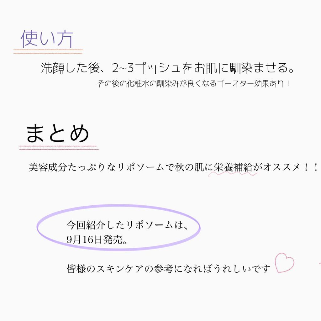 - ・生体組成成分リン脂質から成り、たまねぎ状に幾重にも重なる層の中に美容成分を豊富に抱えた、直径0.1ミクロン(※9)の球状のマイクロカプセルが1滴に1兆個(※1)含まれたリポソーム美容液です。 ・つけた瞬間から、成りかわるように肌に溶け込み、そのものがダイレクトに肌を美しくすることで、うるおいに満ちたハリやツヤのあふれる若々しい印象にみちびきます。 ・角層の奥深くまで浸透し、しっかりと密着、カプセルが外側から少しずつほぐれるように、肌の上で成分が放出され、じっくりと長時間うるおいと美容成分を届けます。 ・乾燥による小ジワを目立たなく(※11)し、乱れたキメも美しく整え、毛穴の目立たない透明感のあるなめらかな肌へみちびきます。 ・低湿度の過酷な環境下でも長時間うるおいを保持し、あらゆる肌不調を未然に防ぎ、乾燥などの外的ストレスに負けない健やかな肌にみちびきます。 ・あとから使う化粧品のなじみをよくするブースティング効果があります。 ・リッチな保湿感がありながらも、べたつかない、みずみずしいオイルフリー処方。 ・乾燥肌にもやさしくなじむ低刺激処方です。 (※9)0.1ミクロン台の粒径。0.1ミクロンは直径1/10000mm (※1)1滴0.1mLとして算出(概算値) (※11)効能評価試験済み