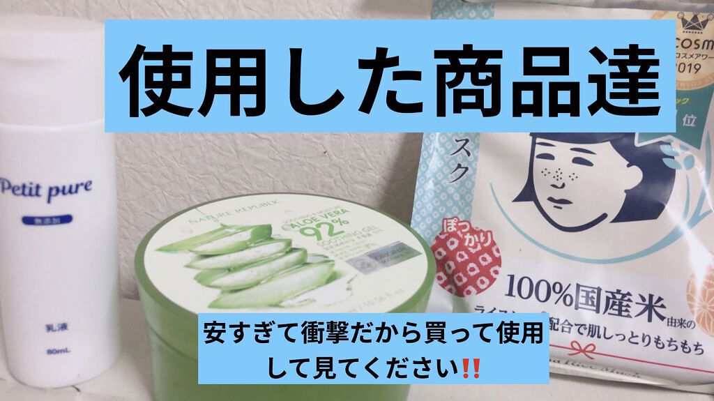 激安⁉️1000円以内?!学生でもできるナイトケア🌃ルーティン紹介【手順】1.お風呂☁️🛁️上がったあとお米マスクをすぐする5~10分程度2.パックをしている間にアロエベラで腕と足に塗る。3.5~10分パックをした後ゆっくり外す4.乳液をコッ...