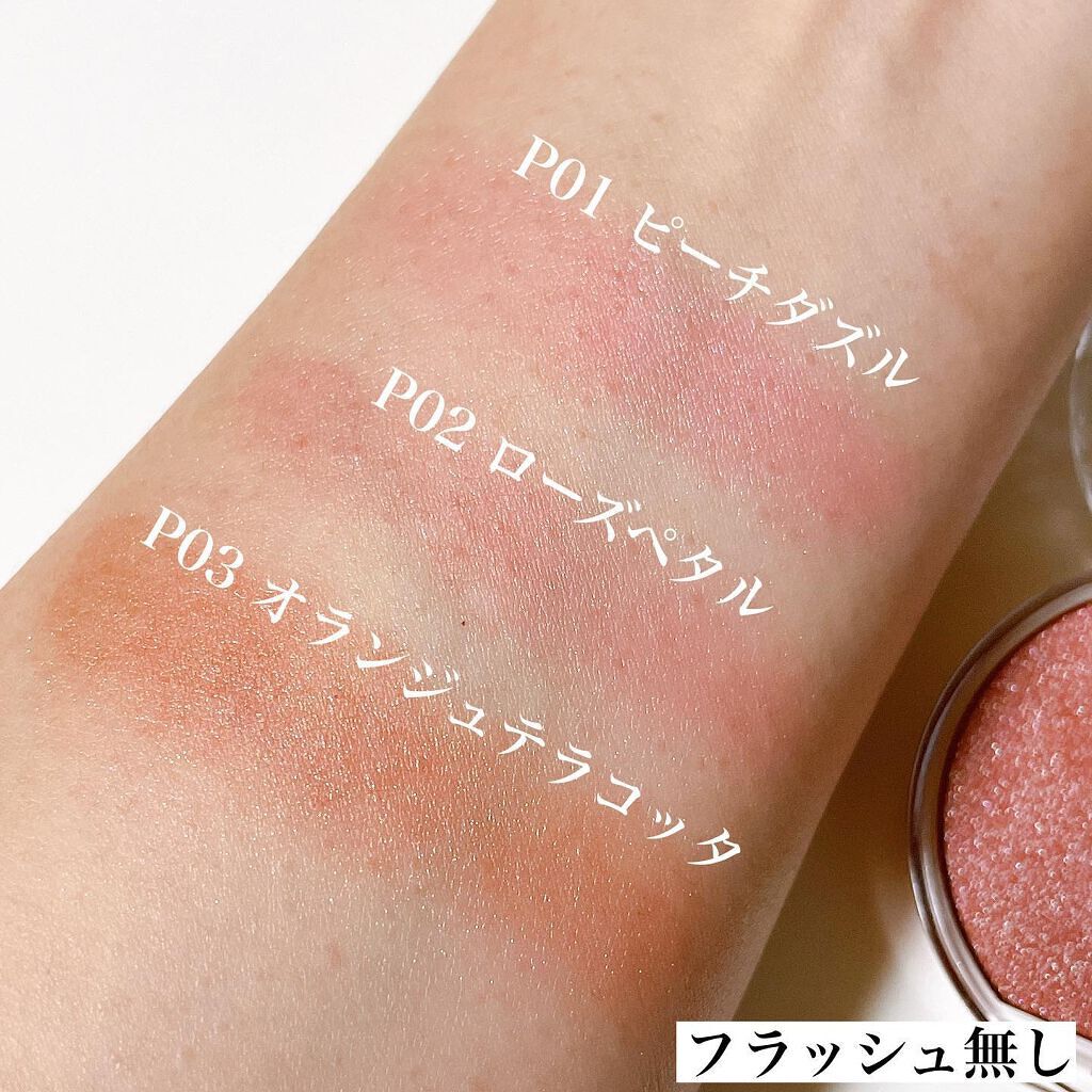 触るとむにゅとした質感、塗るとサラッとした質感になりました。 ピーチダズルは上気したような血色が自然に生まれるピンクコーラル。可愛いらしい色です。 パールとラメ入りなのでツヤのある仕上がりになりました🫶