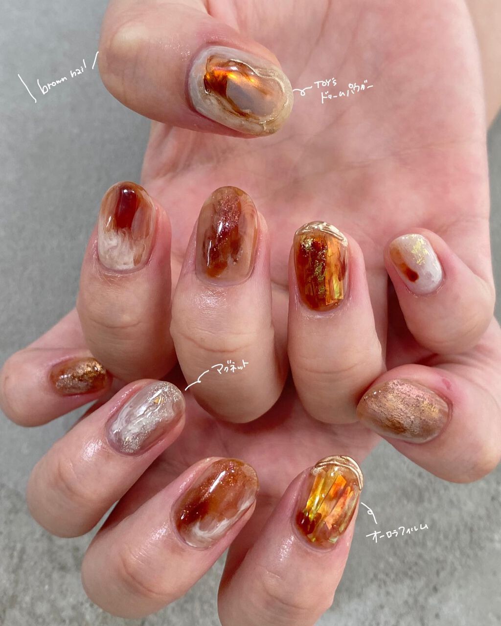 秋っぽいカラー🍠 ブラウンの部分はインクを使ったデザインです! ピンクのオーロラの上に透け感のあるブラウンを重ねて不思議な色合いに☺️👌🏻 フレンチ側もホワイトのパールで一癖🤞🏻