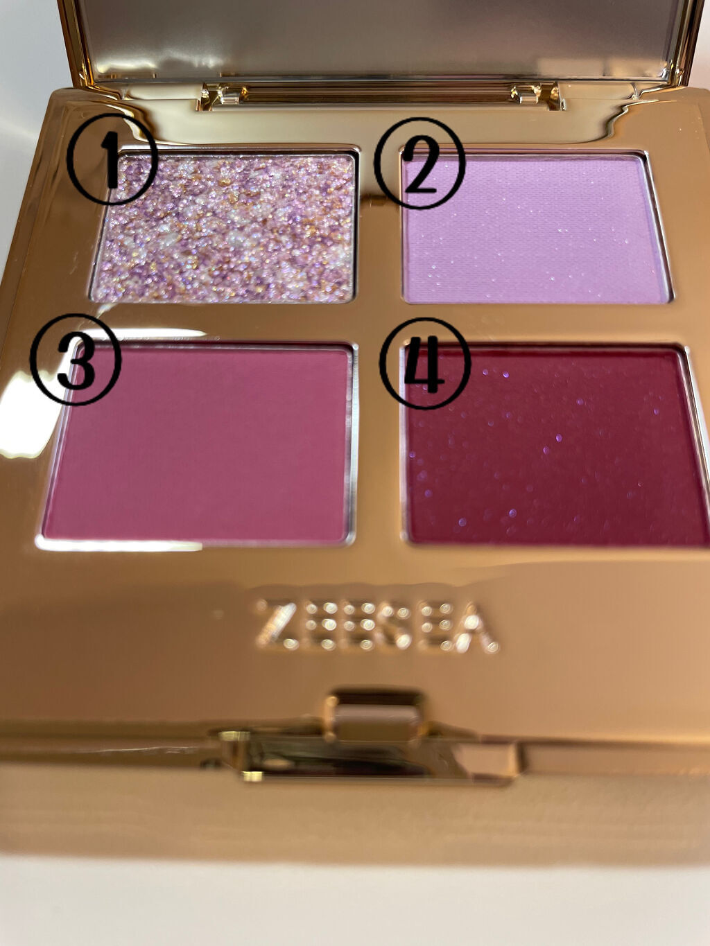 ZEESEAアリスシリーズのアイシャドウパレットも持っていてそちらの方にはパープルカラーが無いので03を購入しました❗️ 下段2色はかなり発色が良いのでつけるときは慎重に💦