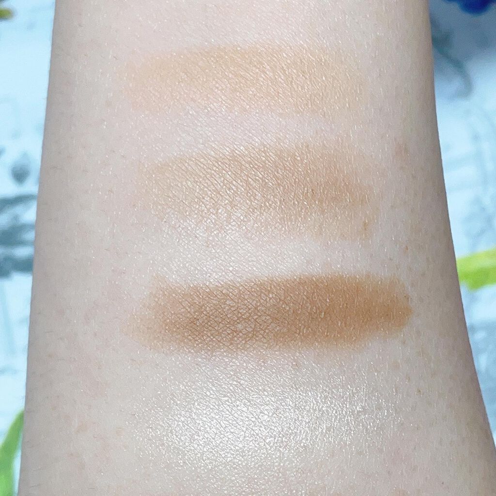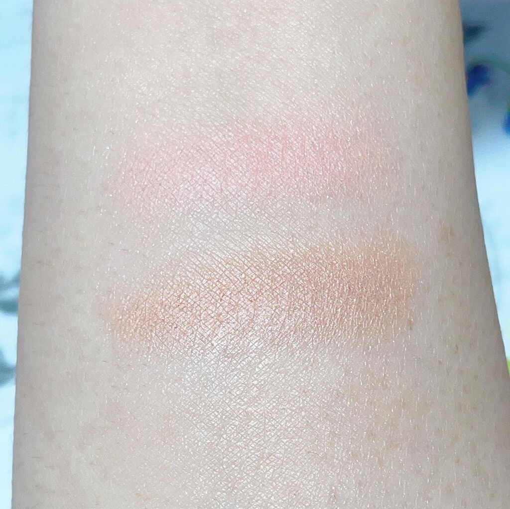 コーラルベース × ゴールドパール × ホワイトパールの3色の組み合わせです!! コーラル系がベースなので日本人の肌に とても馴染むと思います! こちらも薄付きなのでチークは勿論ハイライトとしても使用出来ます! 下瞼から目尻に掛けて塗ればマスク生活でも華やかな目元に仕上がります! コーラル系なので肌を白く見せてくれる色味だと思いました! 使用感も柔かく しっとりしているので保湿効果もあります! デイリーメイクに使いやすい色だと思いました。 目元とリップに重ねると顔全体が統一感が出るので可愛いく仕上げる事が出来ます♡ 写真よりも実際は色味が もっとしっかり出るのでその日の気分によって色の濃さを調整しやすいと思います!