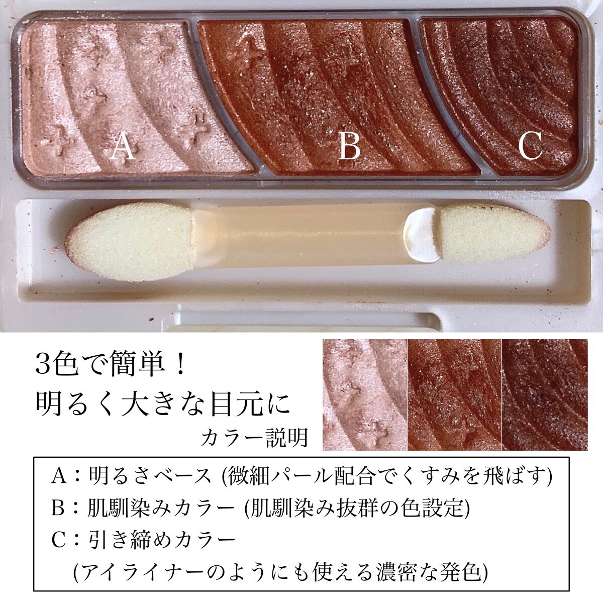 - 3色で簡単に明るく大きな目元に。 しっとり感触のアイシャドウ。 くすみを飛ばす明るさベース、ひとえ・奥二重の方でも幅広く塗れる肌なじみの良い中間色、 濃密高発色の締め色が目の輪郭を強調し大きな目元に。 微細パール配合でくすみを飛ばし、明るい目元へ。