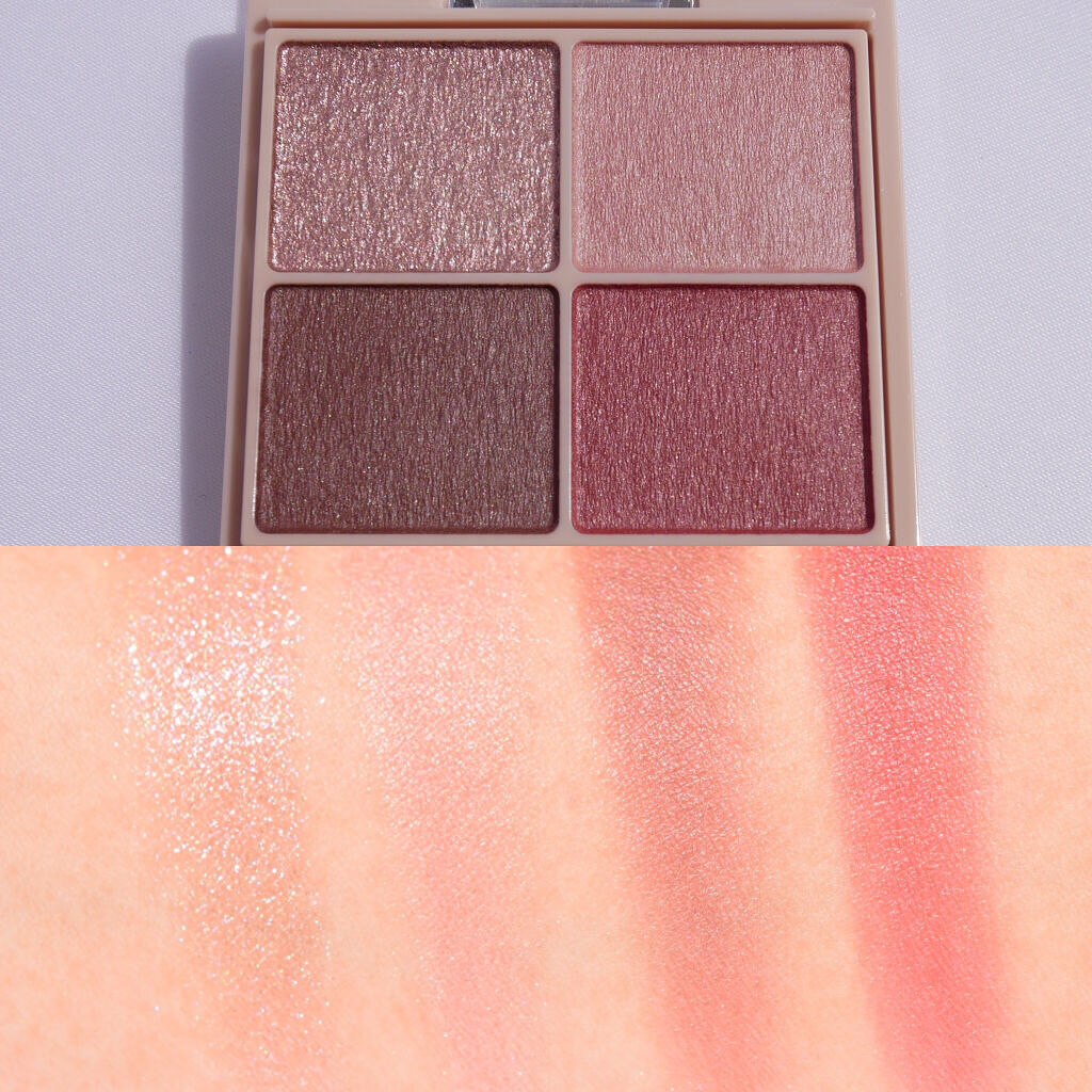 - シルキースフレアイズの姉妹品♡ 肌に溶け込むような透けマットシャドウ 透け感のある柔らかい仕上がりになるマット3色と、透け発色の繊細ラメ1色のパレットシャドウ♡ 完全マットアイや、ラメ×マットアイなど、メイクのパターンを楽しみましょう!