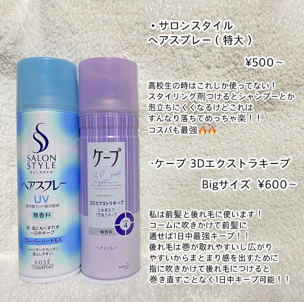 オーシャントリコユニバーサルハードスプレーはキープ力抜群でしかもすぐシャンプーで落とすことができます。 私のおすすめは… ・ザ・プロダクトヘアワックス ・N. ポリッシュオイル ・ケープ 3Dエクストラキープ です!! ・N. ポリッシュオイルとザ・プロダクトヘアワックスを混ぜて使います。 トップの分け目を潰しながら揉みこみ手のひらに残ったものは前髪につけます。 ・ケープ 3Dエクストラキープは前髪や後れ毛に使います。前髪を巻いたあと10~20cm離してシューッと吹きかけます。 これで一日中キープ🙆♀️ そして、後れ毛を巻いた後に指に吹きかけ後れ毛につけます。