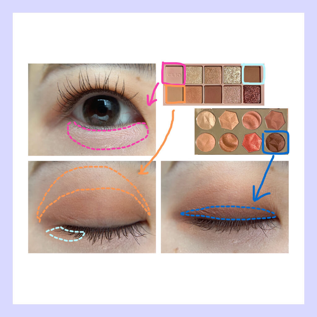 EGLIPSのリトルサンシャインはオレンジパレット界の王さまだと思っています👑 エクセルのピーチメルバは細かいラメがぎっしりで薄づきなので、ベースのすぐ後に全体に塗ってあげると一気に目がオレンジを受け入れられます🧡 最後にのせたBR416はゴールドとレッドのパールがすごく綺麗なので、ピーチメルバとの相性が抜群!