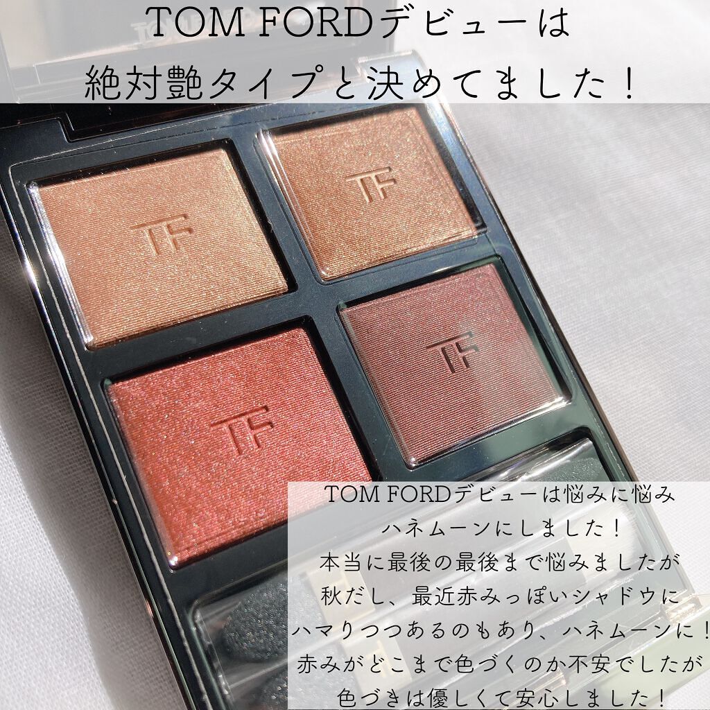 大好きなトムフォードのアイシャドウ✨ ハネムーンは特に上段2色が大好きです🥰 4色のカラーハーモニーで構成されたアイシャドウ。テクスチャーは見たままの鮮やかな発色と色持ちを演出ます。 シアー スパークル、サテン、シマー、マットが絶妙に配色され、ソフトから濃いルックまで自在に。