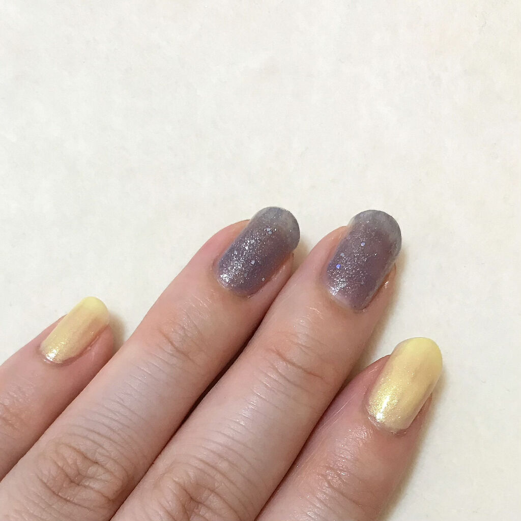 カラバリ豊富! 大きくも小さくもないちょうど良い5mLサイズ! 発色がキレイでボトル通りの発色✨ ベースカラーのくすみブルーに1mmくらいの丸いオーロラホログラムとゴールド系の微粒子ラメがチラチラしててキレイ🫧 寒色の偏光カラーで指先の透明感爆上がり🆙