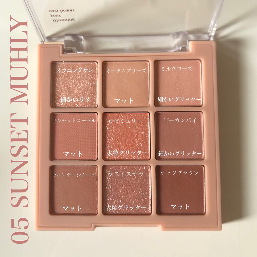 きらっきらラメが3色入っている Sunset Muhly ナチュラルなピンク系 旬なオレンジ系 の目元がつくれます♡ 今日は目立つ目元にしたい!という時は きらきらラメを使うと◎ ナッツブラウン(右下)は まぶたの上でもしっかりと発色します! ラメを使い分ける事で その日の気分に合わせたり、 オフィスメイクから休日メイクまでできるので とても使いやすいです✨ ラメ落ちなども気にならず、 とてもカワイイパレットです♡♡